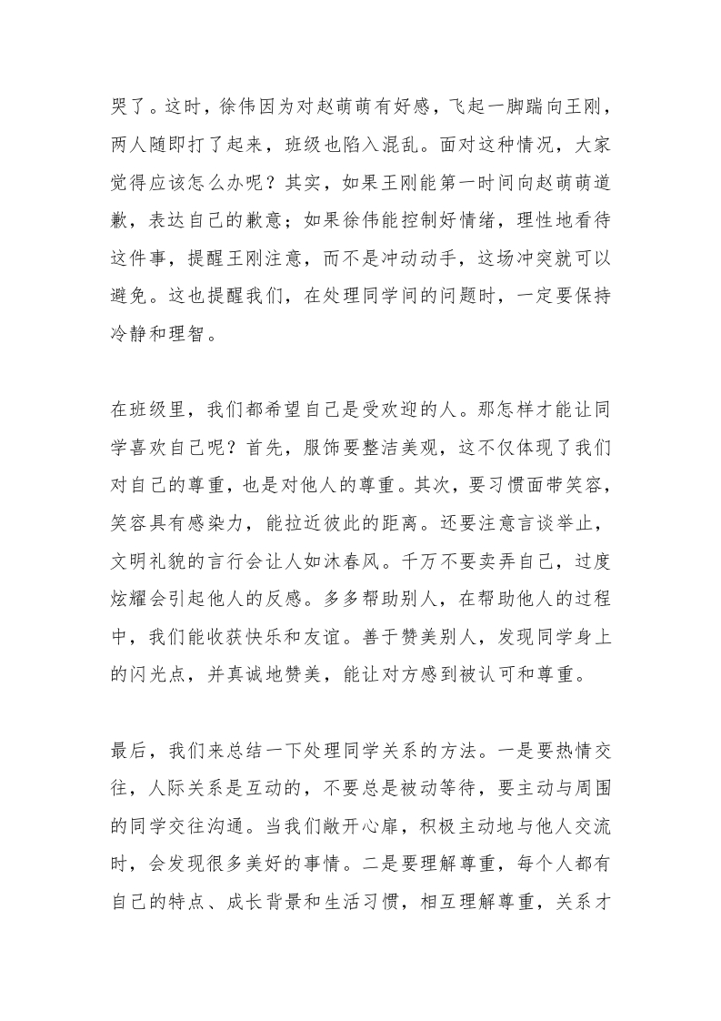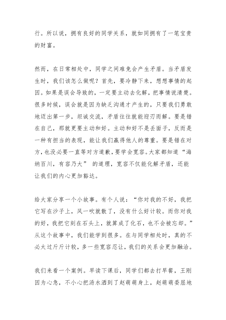 【通用】【交友教育】出题班会:如何正确处理同学关系,构建和谐班级发言稿晨晨老师5天前发布关注私信13.82KB4页0448 以下为资料部分截图预览,下载后为超高清原文件。 第1页 / 共4页 第2页 / 共4页 第3页 / 共4页 试读已结束,还剩1页,您可下载完整版后进行离线阅读 加入VIP,享海量教务资料,无限制免费下载所有材料 【通用】【交友教育】出题班会:如何正确处理同学关系,构建和谐班级发言稿此内容为付费资源,请付费后查看¥9.9¥15.9VIP会员免费代理(享70%分佣)免费立即购买您当前未登录!建议登陆后购买,可保存购买订单付费资源© 版权声明文章版权归作者所有,未经允许请勿转载。THE END综合资料 文本预览 正确处理同学关系,构建和谐班级主题班会发言稿亲爱的同学们:大家好!今天,我们相聚在这里,开展一场关于“正确处理同学关系,构建和谐班级”的主题班会。大家有没有想过,我们来学校是为了什么呢?没错,学习知识是重要的一部分,但学会做人同样关键。在社会这个大群体中,个人的力量很渺小,只有融入人群,才能汇聚强大的力量。而融入人群的关键,就是尊重他人,因为尊重他人其实就是尊重我们自己。那“同学”究竟意味着什么呢?相信大家都有自己的理解。在我看来,同学是我们共同学习做人、学习知识的好伙伴。在课堂上,我们一起探讨难题;在生活中,我们互相分享成长的烦恼。同学还是我们共同面对成功与挫折的精神支持,当我们取得成绩时,他们真诚地为我们鼓掌;当我们遭遇失败时,他们给予鼓励和安慰。同时,同学更是我们共同进步的力量,彼此竞争又相互帮助,携手在成长的道路上不断前 查看更多 收起部分 喜欢就支持一下吧点赞8 分享QQ空间微博QQ好友海报分享复制链接收藏