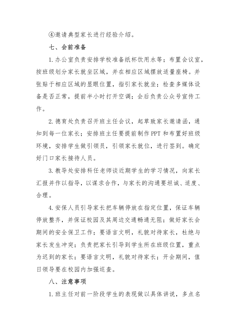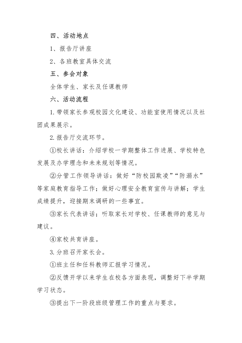 中小学家长会活动实施方案-双向奔赴点亮未来晨晨老师5天前发布关注私信17KB4页04911 以下为资料部分截图预览,下载后为超高清原文件。 第1页 / 共4页 第2页 / 共4页 第3页 / 共4页 试读已结束,还剩1页,您可下载完整版后进行离线阅读 加入VIP,享海量教务资料,无限制免费下载所有材料 中小学家长会活动实施方案-双向奔赴点亮未来此内容为付费资源,请付费后查看¥9.9¥15.9VIP会员免费代理(享70%分佣)免费立即购买您当前未登录!建议登陆后购买,可保存购买订单付费资源© 版权声明文章版权归作者所有,未经允许请勿转载。THE END综合资料 文本预览 双向奔赴点亮未来2024年中小学家长会活动实施方案沟通,为每个学生给出合适的成长解决方案,让家长明白我们的用心,增强信任感,有效的维护家校沟通,充分发挥家校育人合力,一方面为了孩子的学习成绩,更重要的是保障每一个孩子健康全面发展。经学校研究决定,在期中召开一次家长会活动。一、活动目的1.宣传学校办学理念、特色,展现学校良好形象,描绘学校发展愿景,展示学校实施素质教育和办学的成果。使家长更好地了解我们学校,2.向家长汇报学生在校的学习、生活、成长等情况,了解学生在家中的表现。引导家长形成正确的教育观,密切家庭与学校的联系,共同关注孩子健康成长。3.征集家长对学校各项工作的建议,并对学科教师的师德及教育教学工作评价。二、活动主题双向奔赴点亮未来三、活动时间2024年5月15日 查看更多 收起部分 喜欢就支持一下吧点赞11 分享QQ空间微博QQ好友海报分享复制链接收藏