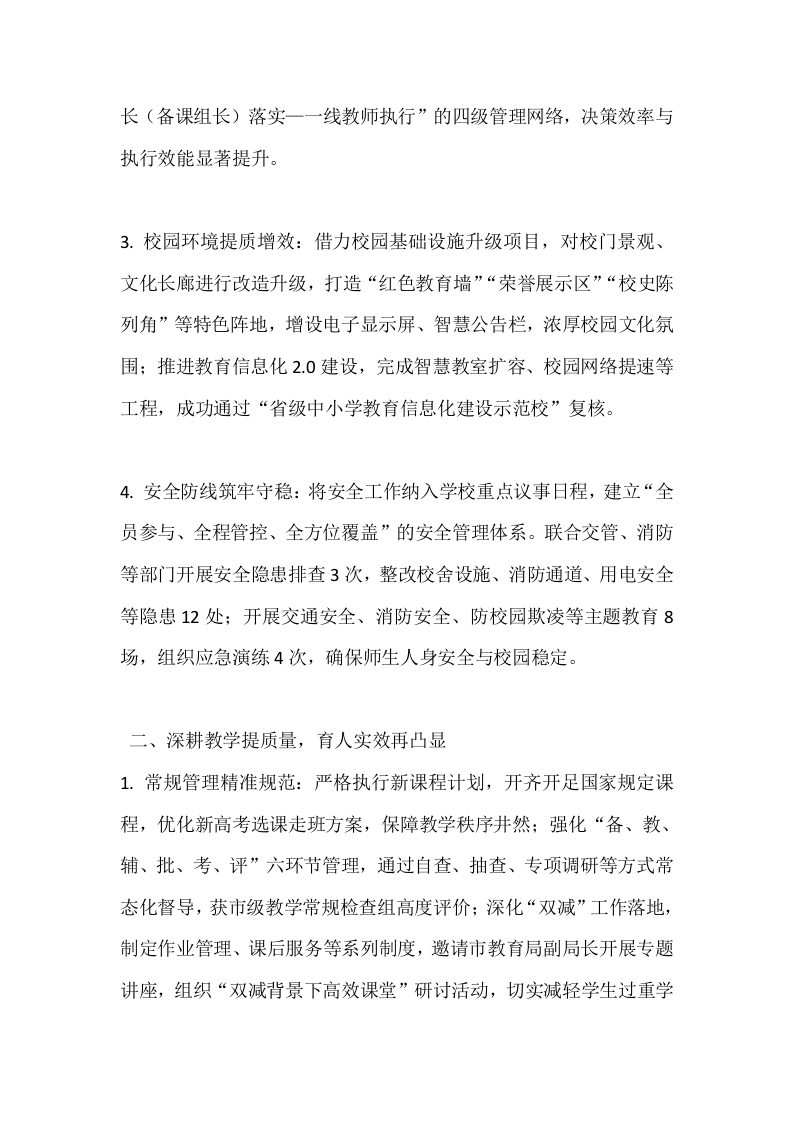 2025-2026学年第一学期学校工作总结会高中校长发言晨晨老师5天前发布关注私信16.13KB6页0505 以下为资料部分截图预览,下载后为超高清原文件。 第1页 / 共6页 第2页 / 共6页 试读已结束,还剩4页,您可下载完整版后进行离线阅读 加入VIP,享海量教务资料,无限制免费下载所有材料 2025-2026学年第一学期学校工作总结会高中校长发言此内容为付费资源,请付费后查看¥9.9¥15.9VIP会员免费代理(享70%分佣)免费立即购买您当前未登录!建议登陆后购买,可保存购买订单付费资源© 版权声明文章版权归作者所有,未经允许请勿转载。THE END计划总结 文本预览 2025-2026学年第一学期学校工作总结会高中校长发言尊敬的各位老师:大家好!时光飞逝,2025-2026学年第一学期即将圆满落幕。在此,我谨代表学校党支部、学校行政,向辛勤耕耘在教育教学一线的全体教职工致以最诚挚的感谢!向大家及家人送上最真切的新年问候与美好祝福!这一学期,是xx高中凝心聚力、提质增效的一学期。在全体同仁的共同努力下,学校办学品牌持续擦亮,各项工作取得显著成效。现将主要工作汇报如下:一、精耕管理强根基,办学保障再升级1.绩效考核平稳落地:12月召开学校第五届第二次教职工代表大会,广泛征求意见、反复研讨修订,高票通过《2025年学校绩效工资实施方案》。方案充分兼顾公平与效率,得到全体教师尤其是资深教师的理解与支持,实现绩效考核的平稳过渡与优化升级。2.管理体系日趋完善:根据学校发展规划,调整优化校务成员分工,明确各岗位职责边界,构建“校务会议决策一中层干部统筹一教研组 查看更多 收起部分 喜欢就支持一下吧点赞5 分享QQ空间微博QQ好友海报分享复制链接收藏