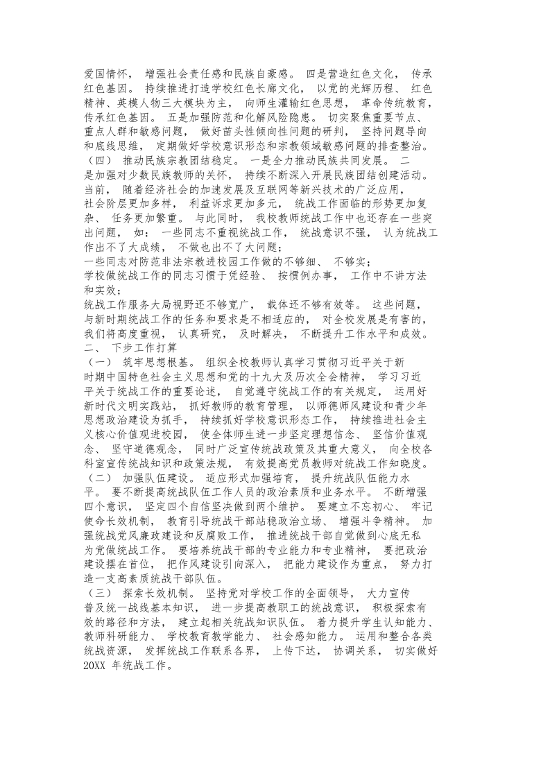 2025年学校统战工作总结学校高度重视统战工作,重视发挥统一战线的独特优势和作用。学校认真贯彻落实中央、省委、市委、县委教育工委各项方针政策和部署要求,始终把统战工作摆在全局工作的重要位置。全校统一战线工作高举爱国主义、社会主义旗帜,牢牢把握大团结大联合主题,着力促进政党关系、民族关系、宗教关系、阶层关系、海内外同胞关系和谐,有效巩固和发展了团结、奋进、开拓、活跃的大好局面,为促进X教育优质均衡发展、社会持久和谐稳定做出重要贡献。一、统战工作开展情况学校统战工作在县委教育工委和县委统战部门的领导下,始终服从服务于县委教育工委工作大局,上下共同努力,通力协作,大胆探索,开拓创新,取得了可喜的成绩,为教育事业事业发展做出了积极贡献。(一)强化了思想政治引领。坚持以习近平新时代中国特色社会主义思想和党的十九大精神引领统一战线,深入贯彻习近平总书记关于加强和改进统一战线工作的重要思想,组织XX全体教职工学习了习近平总书记在教育工作座谈会上的重要讲话精神。党支部专题研究和召开统战工作会议X次,并对学校意识形态领域重大风险进行调研。开展了党外知识分子培训,进一步凝聚思想政治共识。(二)扎实推进制度建设。一是严格履行意识形态工作责任制度和日常管理制度;二是宣传教育宗教政策常态化,在校园内禁止宗教活动、行为、言论服饰、思想以及非法宗教组织向青少年学生传教渗透等现象。开展共青团活动、班会、少先队主题队会、家长学校活动X次。与X名教职工签订不信教承诺书,建立学生家长信教台账和信教教师台账,做好防范渗透和转化工作:三是将重点人群工作纳入常规管理,专人负责引导和管理,宗教言论行为等不得进课堂:四是明确校长、支部书记为第一责任人。与社区、派出所沟通好,形成合力。五是加强宣传,深入排查。加强对重点人群的管控。XX循环播放电子宣传标语、利用橱窗宣传标语X余条,法治报告会X场。(三)加强阵地建设引领。一是常态化开展校园宣传思想文化阵地和网络平台巡查,进一步加强校园意识形态阵地管控,弘扬正能量,提升舆论正面引导能力。二是充分发挥学校教育主阵地的作用,加强思政课教师队伍建设。各科教师特别是思想政治理论课教师结合学科特点,对学生进行爱国主义和社会主义核心价值观教育,引领学生及家长崇尚科学、反对宗教迷信。三是丰富载体开展教育活动。以疫情防控工作中涌现出来的鲜活感人事例为素材,以爱国主义为底色,开展线上国旗进校园、公勺公筷进校园、爱国卫生进校园、抗疫英雄进校园活动,将爱国主义教育、文明用餐教育、爱护环保教育、民族自信教育等融入其中,开展四进校园活动,引导学生心怀使命,向阳而生。引导学生感受危难之中,中国的强大、团结和友爱,激发学生的