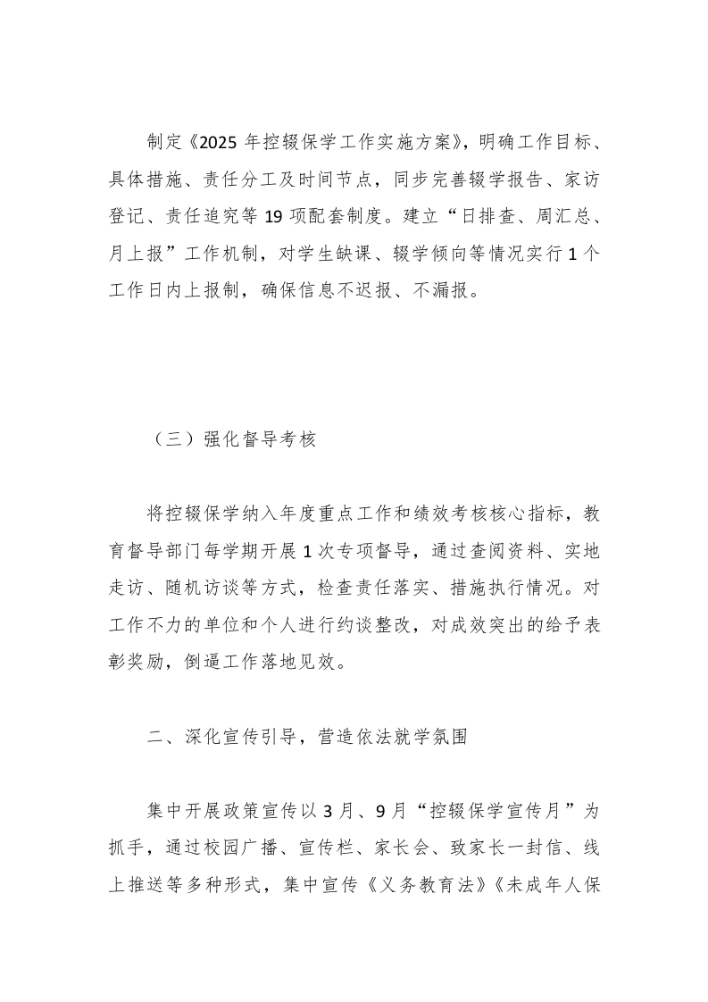 XX镇中心学校2025年控辍保学工作总结晨晨老师5天前发布关注私信14.17KB5页0469 以下为资料部分截图预览,下载后为超高清原文件。 第1页 / 共5页 第2页 / 共5页 试读已结束,还剩3页,您可下载完整版后进行离线阅读 加入VIP,享海量教务资料,无限制免费下载所有材料 XX镇中心学校2025年控辍保学工作总结此内容为付费资源,请付费后查看¥9.9¥15.9VIP会员免费代理(享70%分佣)免费立即购买您当前未登录!建议登陆后购买,可保存购买订单付费资源© 版权声明文章版权归作者所有,未经允许请勿转载。THE END计划总结 文本预览 XX镇中心学校2025年控辍保学工作总结2025年,我们严格落实国家、省、市控辍保学工作部署,以巩固教育脱贫成果、促进教育公平为核心,坚守“不失学、不辍学”底线,全面推进“依法、制度、质量、情感”四位一体控辍模式,圆满完成年度工作目标。现将具体工作情况总结如下:一、强化组织领导,构建闭环责任体系(一)健全工作架构成立由主要领导牵头的控辍保学工作领导小组,建立“统筹部署、股室联动、学校落实”三级责任体系,明确各单位职责分工,形成上下贯通、齐抓共管的工作格局。各学校同步成立以校长为组长的专项工作组,落实“校长包校、班主任包班、任课教师包生”责任包保网络,将控辍任务细化到人、责任压实到岗。(二)完善制度保障 查看更多 收起部分 喜欢就支持一下吧点赞9 分享QQ空间微博QQ好友海报分享复制链接收藏