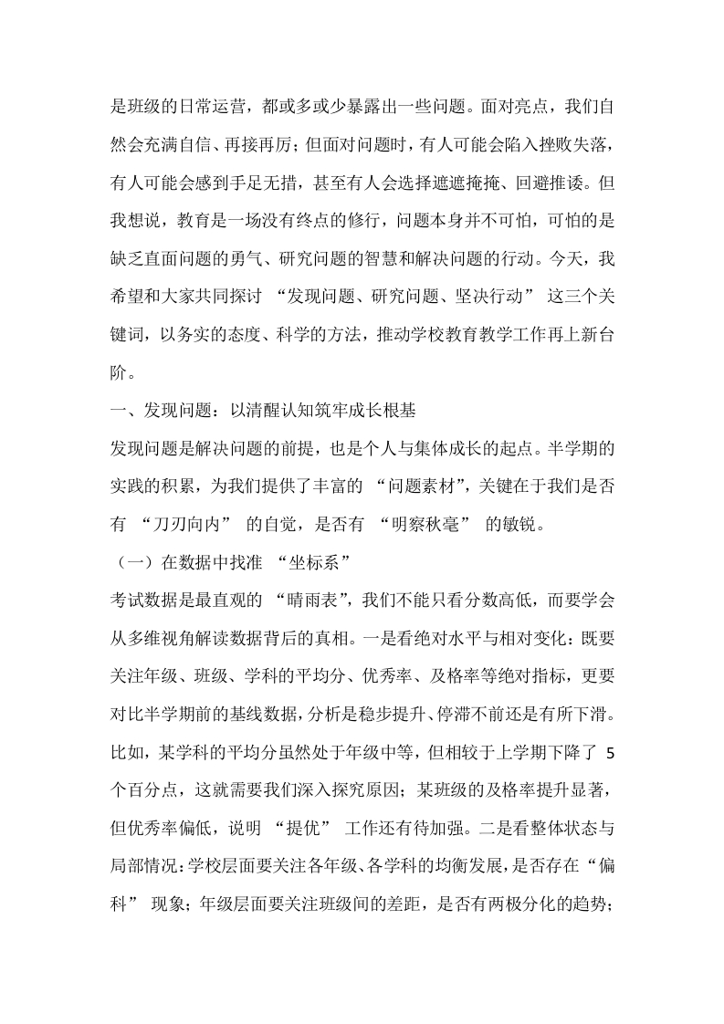 期中考试后,校长在全体教师期中总结暨工作推进大会上的讲话晨晨老师5天前发布关注私信21.60KB13页03713 以下为资料部分截图预览,下载后为超高清原文件。 第1页 / 共13页 第2页 / 共13页 试读已结束,还剩11页,您可下载完整版后进行离线阅读 加入VIP,享海量教务资料,无限制免费下载所有材料 期中考试后,校长在全体教师期中总结暨工作推进大会上的讲话此内容为付费资源,请付费后查看¥9.9¥15.9VIP会员免费代理(享70%分佣)免费立即购买您当前未登录!建议登陆后购买,可保存购买订单付费资源© 版权声明文章版权归作者所有,未经允许请勿转载。THE END计划总结 文本预览 期中考试后,校长在全体教师期中总结暨工作推进大会上的讲话各位老师:大家下午好!金秋时节,硕果可期。转眼间,半学期的教育教学工作己近尾声,期中考试作为检验半学期教学成效的重要节点,既为我们呈现了育人路上的收获与亮点,也为我们指明了亟待优化的方向与短板。今天,我们齐聚这里,不是简单复盘分数的高低,而是以“发现、研究、行动”为核心,共同梳理工作、反思不足、凝聚共识,为后半学期的教育教学工作注入更强劲的动力。过去的半学期,我亲眼见证了每一位老师的辛勤付出:清晨,你们踏着朝阳走进校园,在教室、办公室开启一天的忙碌:深夜,你们还在灯下批改作业、备课教研,只为每一堂课的精彩呈现:课堂上,你们循循善诱、因材施教,努力让每个孩子都能跟上节奏;课后,你们耐心辅导、谈心交流,用爱心守护学生的成长。正是这份坚守与担当,让我们的学校在学风建设、教学质量、学生素养等方面都取得了可圈可点的成绩一一部分学科成绩稳步提升,学生竞赛捷报频传,班级管理亮点纷呈,校园文化氛围日益浓厚。在此,我代表学校,向全体教师致以最诚挚的感谢!但成绩属于过去,问题更需正视。期中考试后,无论是学校层面的整体统筹,处室的职能落实,年级的管理推进,学科组的教研实效,还 查看更多 收起部分 喜欢就支持一下吧点赞13 分享QQ空间微博QQ好友海报分享复制链接收藏