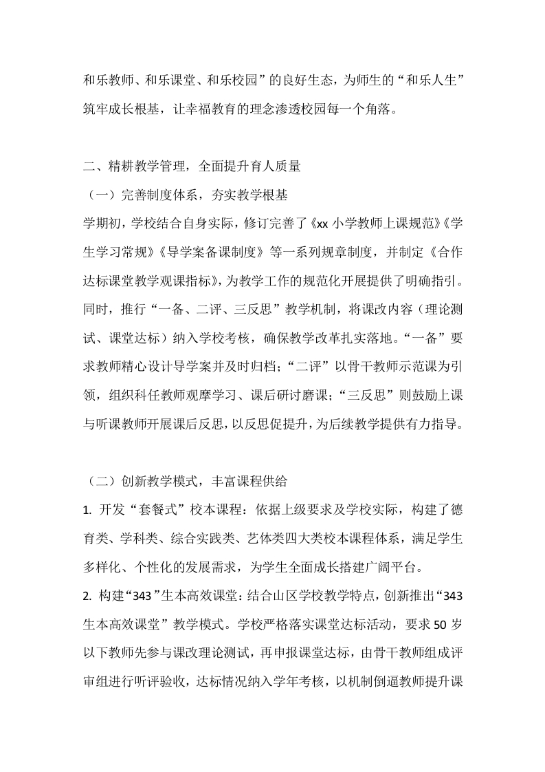 总结一学年来的工作,校长发言:以“和乐”为魂,育全面之才晨晨老师5天前发布关注私信14.47KB5页02711 以下为资料部分截图预览,下载后为超高清原文件。 第1页 / 共5页 第2页 / 共5页 试读已结束,还剩3页,您可下载完整版后进行离线阅读 加入VIP,享海量教务资料,无限制免费下载所有材料 总结一学年来的工作,校长发言:以“和乐”为魂,育全面之才此内容为付费资源,请付费后查看¥9.9¥15.9VIP会员免费代理(享70%分佣)免费立即购买您当前未登录!建议登陆后购买,可保存购买订单付费资源© 版权声明文章版权归作者所有,未经允许请勿转载。THE END计划总结 文本预览 总结一学年来的工作,校长发言:以“和乐”为魂,育全面之才一学年来,在市教育局、镇教育办公室的悉心指导与大力支持下,x小学全体教职工凝心聚力、务实笃行,深入落实上级文件精神,聚焦学校内涵发展,稳步推进教育教学改革。尤其新学期以来,学校充实了骨干教师力量,为教育教学注入新活力,教学质量实现显著提升。本学年,学校始终围绕“坚持以人为本,科学管理,让学生终身和乐发展”这一核心主题,重点推进四项工作,现将具体情况总结如下:一、深耕“和乐”文化,打造幸福校园环境为响应上级教育均衡化、标准化验收及x市规范化验收要求,学校加大硬件设施投入,全面改善办学条件。累计投资3万余元完成教学楼楼顶防水改造,投入2万余元对教学楼内外墙进行整体粉刷,让校园面貌焕然一新;花费2万余元购置2007册图书及5个图书橱、阅览橱,丰富师生阅读资源:同时加固体育器材设施,引进小黄杨、红叶紫波等绿化苗木,进一步优化校园生态环境,为师生营造了整洁、优美、舒适的学习工作氛围。以创建幸福学校为统领,学校深度践行“正德以出乐,和乐以成顺”的办学理念,坚守“让学生终身和乐发展”的办学宗旨,明确“让山区每一位孩子全面发展”的核心办学目标。学校将“和乐”确立为核心精神文化,寓意“和谐快乐、和和乐乐”,致力于构建“和乐学生、 查看更多 收起部分 喜欢就支持一下吧点赞11 分享QQ空间微博QQ好友海报分享复制链接收藏