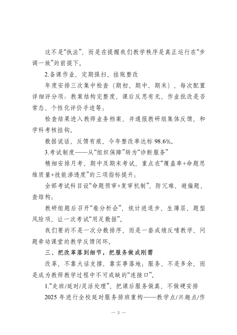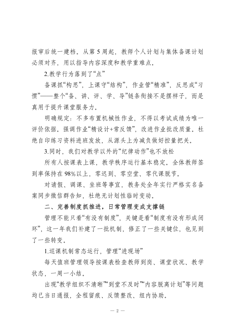2025秋季学期初中教导处工作总结:既有“破局”,更有“落地”!晨晨老师昨天发布关注私信23KB5页04313 以下为资料部分截图预览,下载后为超高清原文件。 第1页 / 共5页 第2页 / 共5页 第3页 / 共5页 试读已结束,还剩2页,您可下载完整版后进行离线阅读 加入VIP,享海量教务资料,无限制免费下载所有材料 2025秋季学期初中教导处工作总结:既有“破局”,更有“落地”!此内容为付费资源,请付费后查看¥9.9¥15.9VIP会员免费代理(享70%分佣)免费立即购买您当前未登录!建议登陆后购买,可保存购买订单付费资源© 版权声明文章版权归作者所有,未经允许请勿转载。THE END计划总结 文本预览 2025秋季学期初中教导处工作总结:既有“破局”,更有“落地”!尊敬的各位领导、亲爱的老师们:下午好!今天由我代表教务处,对过去一年我们的教学组织与管理工作做一个系统回顾与阶段性小结。说实在的,这一年,我们是靠着一股“挤”出来的认真、“拼”出来的节奏,以及全体教师“沉下去、动起来”的执行力,才一步步扛住了任务、稳住了质量、答好了动作。也正因为如此,我认为这份总结,不只是报成绩,更重要的是:总结经验、找出不足、明确方向,让所有投入保障教育质量的人都看见自己的价值。下面我将从三大板块,谈我们的主要工作内容。一、围绕主责抓基础,教学常规不松手、不悬空这一年,教务工作始终把“抓准节奏、吃透计划、落到细节”作为桌面任务来推进一一我们默契一个共识:任何教学质量的突破,第一步都必须从常规做得结实开始。1.教学计划运行我们盯到了“人”每学期开学前,我们协同年段、教研组,完成课程总表、教师安排、学科齐设的统一编排,并进行三轮教学任务对照调整,确保“人人有计划、课课有目标”。所有学科教师必须按课程标准、学情实际制定本学期计划,1- 查看更多 收起部分 喜欢就支持一下吧点赞13 分享QQ空间微博QQ好友海报分享复制链接收藏