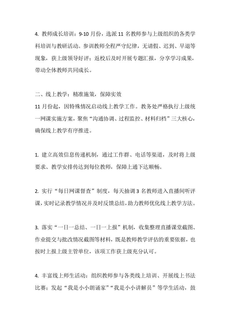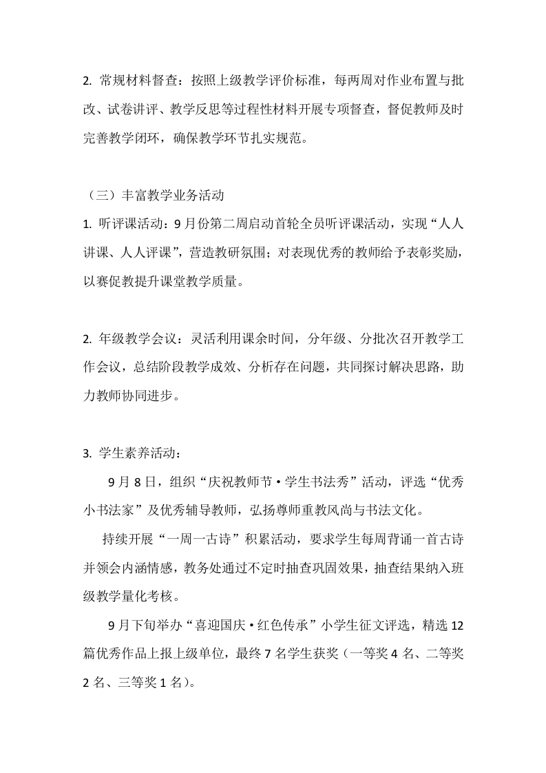 2025-2026秋季学年上学期教务工作总结晨晨老师前天发布关注私信14.07KB4页03612 以下为资料部分截图预览,下载后为超高清原文件。 第1页 / 共4页 第2页 / 共4页 第3页 / 共4页 试读已结束,还剩1页,您可下载完整版后进行离线阅读 加入VIP,享海量教务资料,无限制免费下载所有材料 2025-2026秋季学年上学期教务工作总结此内容为付费资源,请付费后查看¥9.9¥15.9VIP会员免费代理(享70%分佣)免费立即购买您当前未登录!建议登陆后购买,可保存购买订单付费资源© 版权声明文章版权归作者所有,未经允许请勿转载。THE END综合资料 文本预览 2025-2026秋季学年上学期教务工作总结本学期已近尾声,在上级教育部门的关心支持与全校教师的积极配合下,我校教务处紧紧围绕“提质增效、规范管理、赋能成长”的核心目标,扎实推进线下与线上教学各项工作,圆满完成学期既定教学任务。现将本学期重点教务工作汇报如下:一、线下教学:夯实基础,提质增效(一)科学统筹课程分配结合学校教师队伍调配实际,教务处牵头开展本学期任课教师优化配置工作。调配前召开全体教师会议,广泛听取任课意愿,全面掌握每位教师的优势学科、教学特长及年龄、身体状况。延续“23名教师负责一个班级核心教学”的配置模式,教务处统筹语数英主干课程分配,其他学科由班级任课教师协商分工。全体教师全力支持配合,即便部分课程存在调配冲突,也主动接纳安排,无一例拒绝任课现象,确保课程分配科学合理、落地高效。(二)规范过程材料管理1.备课管理:严格落实“先周备课”要求,为教师备课提供充足资源支持与时间保障:每两周收交一次备课材料,组织专人进行评审,对优质备课案例予以表彰推广,对存在问题的及时反馈整改。 查看更多 收起部分 喜欢就支持一下吧点赞12 分享QQ空间微博QQ好友海报分享复制链接收藏