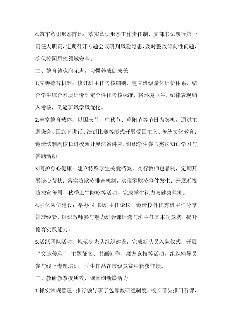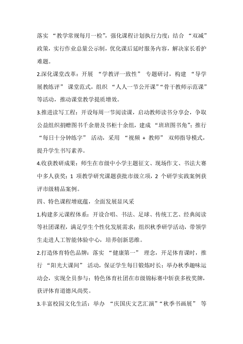 2025-2026学年第一学期(秋季学期)学校工作总结:秋实蕴育初心,匠心深耕育人晨晨老师前天发布关注私信15.06KB6页0246 以下为资料部分截图预览,下载后为超高清原文件。 第1页 / 共6页 第2页 / 共6页 第3页 / 共6页 试读已结束,还剩3页,您可下载完整版后进行离线阅读 加入VIP,享海量教务资料,无限制免费下载所有材料 2025-2026学年第一学期(秋季学期)学校工作总结:秋实蕴育初心,匠心深耕育人此内容为付费资源,请付费后查看¥9.9¥15.9VIP会员免费代理(享70%分佣)免费立即购买您当前未登录!建议登陆后购买,可保存购买订单付费资源© 版权声明文章版权归作者所有,未经允许请勿转载。THE END综合资料 文本预览 2025-2026学年第一学期(秋季学期)学校工作总结:秋实蕴育初心,匠心深耕育人金风送爽启新程,硕果盈枝话耕耘。2025-2026学年第一学期,在上级教育主管部门的正确领导下,在社会各界的大力支持下,学校全面贯彻党的教育方针,深入落实上级教育工作会议精神,以“提高教育教学质量、促进教育内涵发展”为中心,锚定“观念突破、管理突破”两大目标,抓实“党建引领、安全保障、质量提升、多元发展”四大重点,通过“常规管理精细化、师德师能常态化、健康教育规范化、文化建设特色化”四项举措,稳步推进各项工作落地见效,赢得各级部门肯定与群众广泛认可。一、党建引领强根基,凝心聚力促发展1压实党建责任:严格履行党建与党风廉政建设主体责任,落实“三重一大”决策制度,开展师德师风专题教育、廉洁从教主题活动,筑牢思想防线。2.深化理论武装:规范落实“三会一课”制度,组织党员专题学习党的创新理论、党章党规及纪律条例,开展“不忘初心廉洁从教”警示教育与党纪学习教育,支部书记带头讲党课,定期召开组织生活会与民主生活会。3激活组织活力:开展主题党日系列活动,组织党员参与文明城市创建、校园志愿服务等实践,推行“党员亮身份”行动,党员干部深入教师群体开展暖心帮扶,彰显先锋模范作用。 查看更多 收起部分 喜欢就支持一下吧点赞6 分享QQ空间微博QQ好友海报分享复制链接收藏