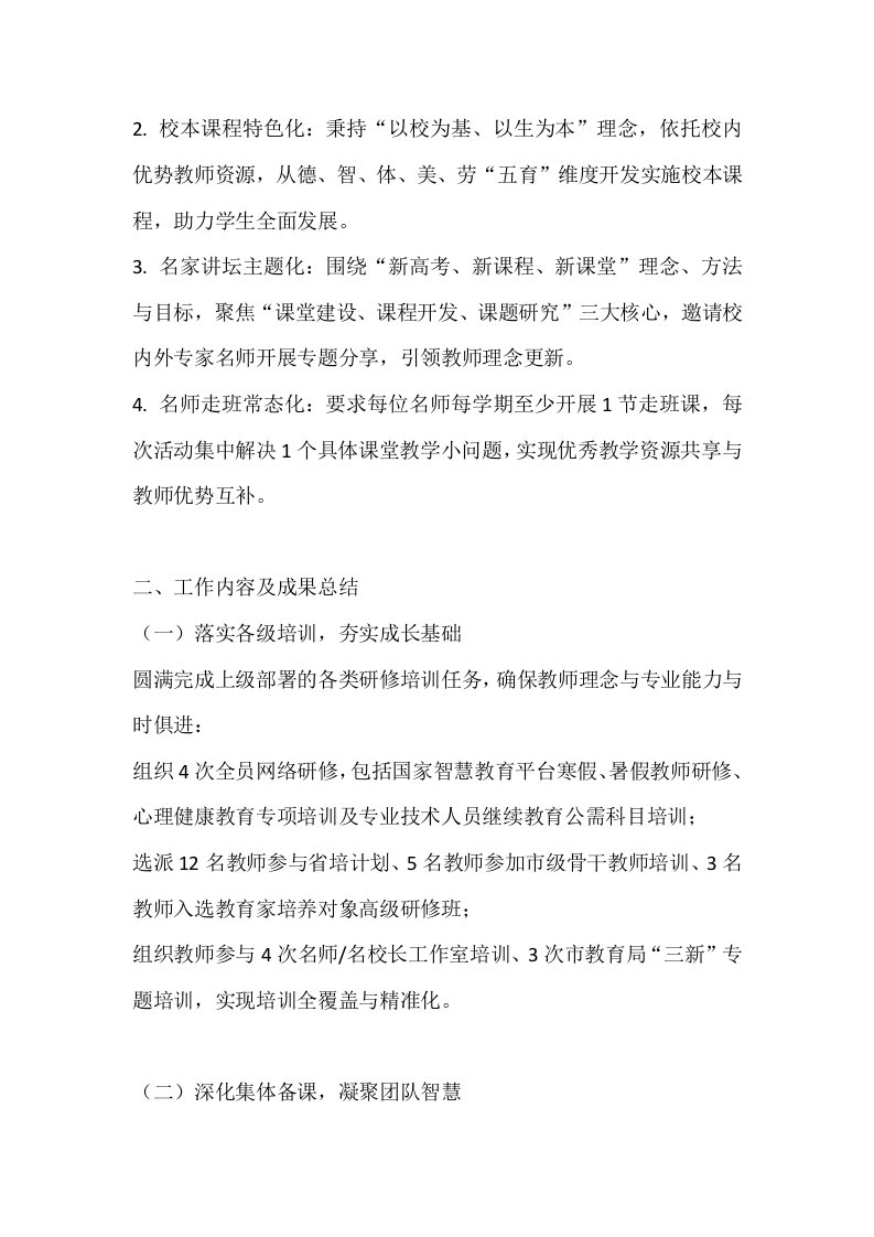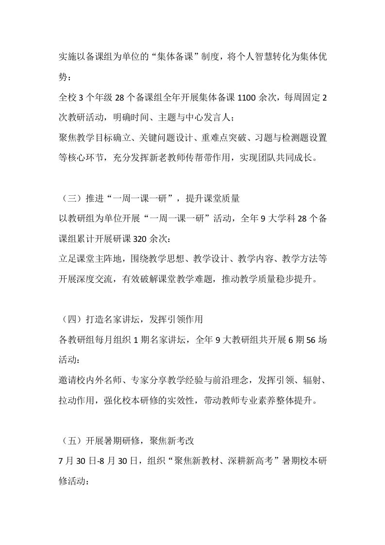 2025年度XX高中校本研修工作总结晨晨老师前天发布关注私信14.45KB5页02110 以下为资料部分截图预览,下载后为超高清原文件。 第1页 / 共5页 第2页 / 共5页 第3页 / 共5页 试读已结束,还剩2页,您可下载完整版后进行离线阅读 加入VIP,享海量教务资料,无限制免费下载所有材料 2025年度XX高中校本研修工作总结此内容为付费资源,请付费后查看¥9.9¥15.9VIP会员免费代理(享70%分佣)免费立即购买您当前未登录!建议登陆后购买,可保存购买订单付费资源© 版权声明文章版权归作者所有,未经允许请勿转载。THE END综合资料 文本预览 2025年度X高中校本研修工作总结今年,我校校本研修工作以“促进学校高质量发展、助力教师专业成长”为核心目标,立足本校教育教学实际问题,面向全体教师、突出重点任务,通过教师培训、学科教研、集体研讨、个人反思等多元形式,深入开展校内学习与研究活动,有效提升了教师综合素养与业务能力,为学校教育教学质量的可持续发展提供了坚实支撑。现将本年度工作总结如下:一、工作思路及创新举措(一)核心工作思路教师素质是教育事业发展的核心动力,也是学校办学水平的关键支撑。今年,我校在充分调研教师需求与教学痛点的基础上,延续并深化“教学推动教研,教研反哺教学”的工作思路,以课堂教学实际问题为导向,通过研课、讲坛、培训、课程开发等核心活动,引导教师主动学习、自主提升,着力打造高素质专业化教师队伍。(二)关键创新举措围绕核心思路,我校在实践中优化并探索出多项务实有效的研修举措:1.研课精准化:明确每次研课必须聚焦课堂教学“三破”目标一一破难点、破重点、破考点,推动教研与教学深度融合,避免研课形式化。 查看更多 收起部分 喜欢就支持一下吧点赞10 分享QQ空间微博QQ好友海报分享复制链接收藏