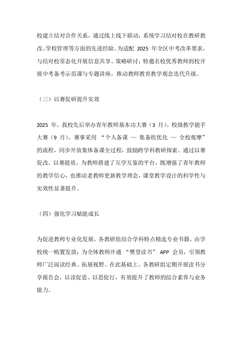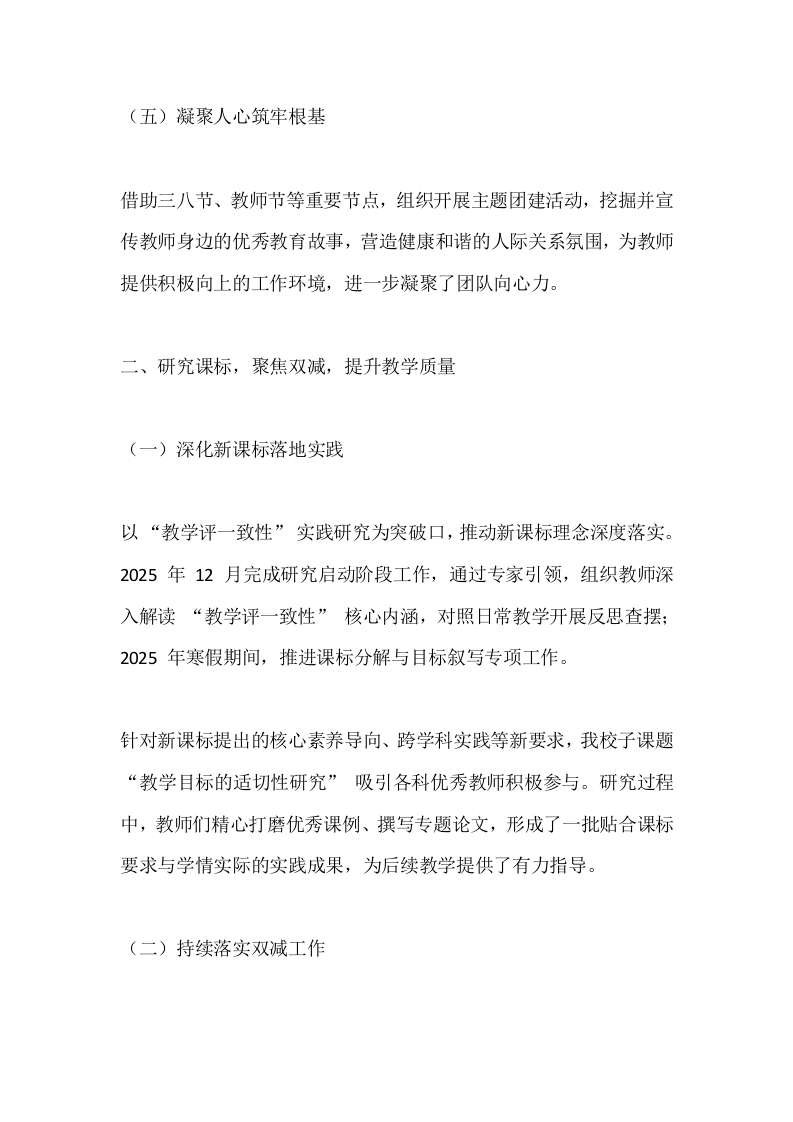 2025年度初中校长学校工作总结:全心管理,全意育人晨晨老师前天发布关注私信15.91KB8页0397 以下为资料部分截图预览,下载后为超高清原文件。 第1页 / 共8页 第2页 / 共8页 第3页 / 共8页 试读已结束,还剩5页,您可下载完整版后进行离线阅读 加入VIP,享海量教务资料,无限制免费下载所有材料 2025年度初中校长学校工作总结:全心管理,全意育人此内容为付费资源,请付费后查看¥9.9¥15.9VIP会员免费代理(享70%分佣)免费立即购买您当前未登录!建议登陆后购买,可保存购买订单付费资源© 版权声明文章版权归作者所有,未经允许请勿转载。THE END综合资料 文本预览 2025年度初中校长学校工作总结:全心管理,全意育人2025年,是我校深耕内涵、提质增效的关键一年。在上级部门的正确引领下,全体师生凝心聚力、务实笃行,以“立德树人”为总目标,以“转作风、抓管理、提质量、树形象”为指向,在夯实常规工作基础上,聚焦教师队伍建设、教研教改创新、办学品质提升,各项工作取得阶段性成效。现将本年度工作重点汇报如下:一、守正创新,对标先进,优化队伍建设(一)抓实新教师培养近年来,青年教师队伍持续壮大,为学校发展注入新鲜活力。新教师入校后,学校第一时间召开座谈会,解读办学理念与管理制度,要求其1个月内完成新课标研学、量化考核制度学习,并制定个人三年职业规划。结合教师个性特长精准配置岗位,同时推行“青蓝结对”工程,为新教师配备学科教学与班主任工作双导师,助力其快速站稳讲台、成长成才。(二)对标名校提质增效秉持“取长补短、借力发展”理念,我校积极与市内外两所优质学 查看更多 收起部分 喜欢就支持一下吧点赞7 分享QQ空间微博QQ好友海报分享复制链接收藏
