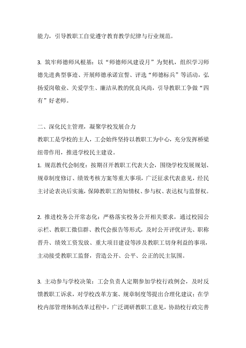 2025秋季第一学期学校工会工作总结晨晨老师2个月前发布关注私信15.54KB5页0407 以下为资料部分截图预览,下载后为超高清原文件。 第1页 / 共5页 第2页 / 共5页 第3页 / 共5页 试读已结束,还剩2页,您可下载完整版后进行离线阅读 加入VIP,享海量教务资料,无限制免费下载所有材料 2025秋季第一学期学校工会工作总结此内容为付费资源,请付费后查看¥9.9¥15.9VIP会员免费代理(享70%分佣)免费立即购买您当前未登录!建议登陆后购买,可保存购买订单付费资源© 版权声明文章版权归作者所有,未经允许请勿转载。THE END综合资料 文本预览 2025秋季第一学期学校工会工作总结这学期,我校工会在区教育工会及学校党支部的坚强领导下,以习近平新时代中国特色社会主义思想为指导,深入学习贯彻中国工会十八大精神,紧扣学校“整体优化、和谐发展”的工作方向,围绕教书育人核心任务,以提升教职工综合素质为目标,扎实推进教师队伍建设、学校民主建设与工会自身建设,认真履行工会“维护、建设、参与、教育”四项基本职能,完善教代会制度,深化校务公开,最大限度调动教职工的积极性与创造性,为学校物质文明和精神文明建设注入了强劲动力。一、强化学习培训,提升教职工综合素养打造高素质教师队伍是学校发展的核心,工会积极配合学校开展系列活动,全方位提升教职工思想素质与业务能力。1.深化理论与业务学习:组织教职工深入学习习近平新时代中国特色社会主义思想、党的教育方针及2022版新课程标准,通过专题讲座、分组研讨、线上学习等形式,拓宽教育教学思路:搭建业务交流平台,配合教务处开展名师示范课、同课异构等教研活动,助力教职工专业成长。2.加强法治素养培育:开展《教师法》《未成年人保护法》《工会法》等法律法规专题学习,提升教职工依法执教、依法维权的意识与 查看更多 收起部分 喜欢就支持一下吧点赞7 分享QQ空间微博QQ好友海报分享复制链接收藏