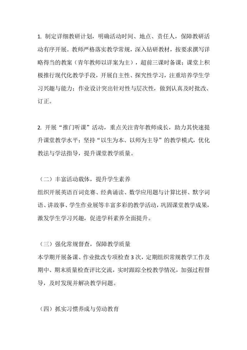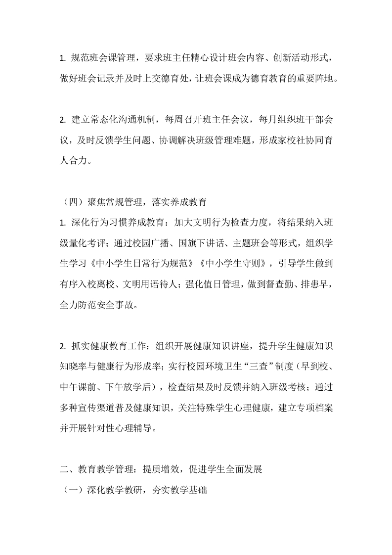 2025秋季第一学期学校工作总结晨晨老师前天发布关注私信16.41KB7页02210 以下为资料部分截图预览,下载后为超高清原文件。 第1页 / 共7页 第2页 / 共7页 第3页 / 共7页 试读已结束,还剩4页,您可下载完整版后进行离线阅读 加入VIP,享海量教务资料,无限制免费下载所有材料 2025秋季第一学期学校工作总结此内容为付费资源,请付费后查看¥9.9¥15.9VIP会员免费代理(享70%分佣)免费立即购买您当前未登录!建议登陆后购买,可保存购买订单付费资源© 版权声明文章版权归作者所有,未经允许请勿转载。THE END综合资料 文本预览 2025秋季第一学期学校工作总结本学期,我校秉持“追求和谐,享受快乐”的办学理念,弘扬“团结、务实、创新”的学校精神,稳步推进教育教学高质量发展,各项工作在全体教职工的共同努力下取得显著成效。现将本学期工作总结如下:一、德育工作:筑牢育人根基,培育时代新人(一)完善制度体系,凝聚德育合力结合学校发展实际,进一步细化《班级流动红旗评比细则》《班主任量化评价方案》等德育管理制度,推动德育工作规范化、常态化。建立值周领导、值周教师、值周生“三位一体”检查机制,对学生日常行为、班级常规管理开展每日检查、每周考核、每月汇总奖评,确保德育要求落到实处。(二)强化队伍建设,提升育人水平1.修订完善《班级量化管理细则》《班主任量化评价方案》,将教学实效、常规落实、工作纪律等纳入考评,激励班主任履职尽责。2.加强理论学习与业务培训,定期组织班主任、值日教师、值周学生开展工作培训,提升德育管理能力:组织教师积极参与上级各类德育活动与竞赛,拓宽育人思路。(三)狠抓班级管理,深化德育实效 查看更多 收起部分 喜欢就支持一下吧点赞10 分享QQ空间微博QQ好友海报分享复制链接收藏