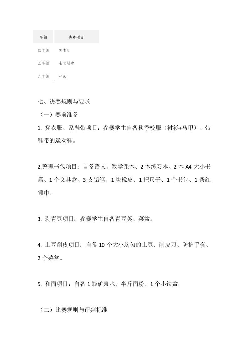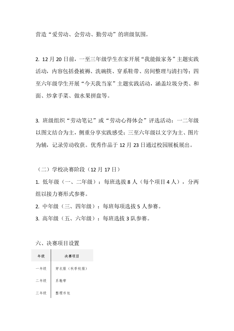 XX小学2025秋季第一学期学生劳动技能大赛方案晨晨老师前天发布关注私信16.45KB6页0366 以下为资料部分截图预览,下载后为超高清原文件。 第1页 / 共6页 第2页 / 共6页 第3页 / 共6页 试读已结束,还剩3页,您可下载完整版后进行离线阅读 加入VIP,享海量教务资料,无限制免费下载所有材料 XX小学2025秋季第一学期学生劳动技能大赛方案此内容为付费资源,请付费后查看¥9.9¥15.9VIP会员免费代理(享70%分佣)免费立即购买您当前未登录!建议登陆后购买,可保存购买订单付费资源© 版权声明文章版权归作者所有,未经允许请勿转载。THE END综合资料 文本预览 x小学2025秋季第一学期学生劳动技能大赛方案一、指导思想为深入贯彻《关于全面加强新时代大中小学劳动教育的意见》,落实2022版新《劳动教育课程标准》,充分发挥劳动教育的独特育人功能,引导学生积极参与劳动实践,锤炼动手能力,养成独立生活习惯,深刻理解“劳动创造美好生活”的内涵,我校特举办“弘扬时代精神,争做劳动少年”学生劳动技能大赛,推动养成教育与劳动教育深度融合。二、参赛对象全校学生以班级为单位参与,实现全员覆盖。三、活动主题弘扬时代精神,争做劳动少年四、比赛时间2025年12月16日-12月17日(决赛12月17日)五、活动安排(一)班级展示阶段(12月16日-12月16日)1.各中队召开“劳动小能手”启动仪式,开展劳动主题教育活动, 查看更多 收起部分 喜欢就支持一下吧点赞6 分享QQ空间微博QQ好友海报分享复制链接收藏