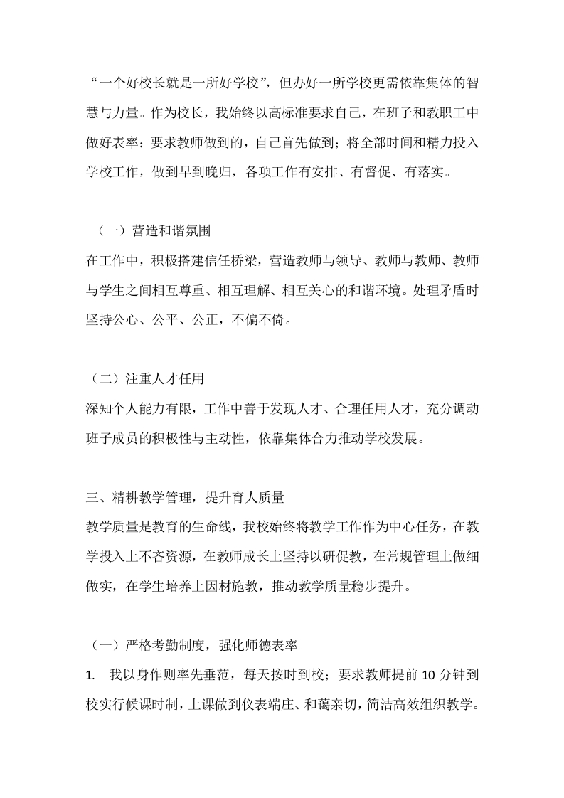 秋季学期校长述职报告:自主发展强根基,守正创新促长效晨晨老师22小时前发布关注私信14.72KB5页0295 以下为资料部分截图预览,下载后为超高清原文件。 第1页 / 共5页 第2页 / 共5页 试读已结束,还剩3页,您可下载完整版后进行离线阅读 加入VIP,享海量教务资料,无限制免费下载所有材料 秋季学期校长述职报告:自主发展强根基,守正创新促长效此内容为付费资源,请付费后查看¥9.9¥15.9VIP会员免费代理(享70%分佣)免费立即购买您当前未登录!建议登陆后购买,可保存购买订单付费资源© 版权声明文章版权归作者所有,未经允许请勿转载。THE END综合资料 文本预览 秋季学期校长述职报告:自主发展强根基,守正创新促长效尊敬的各位领导、老师们:大家好!在局领导的信任与全体师生的关怀支持下,今年我继续担任z小学校长。本学期,学校在教育局和中心校的正确领导下,在镇、村两级政府的关怀支持下,在全体教职员工的共同努力下,克服专任教师短缺的困难,扎实推进各项工作,教学质量显著提升,走出了一条农村小学依靠挖掘自身潜力实现优质发展的道路。现将本学期履职情况汇报如下,核心围绕“坚持以人为本,科学管理,走自主发展道路,确保学校的可持续发展”这一主题展开,请予评议。一、锚定办学方向,明确发展蓝图本学期,我校立足农村教育实际、着眼学生长远发展,确立“以人为本,科学管理,全面发展,学有所长”的办学理念,以培养“行为良好、体魄健康、求知主动、人格健全、生活自主、创新发展”的合格人才为目标,进一步规范校园管理,强化养成教育,大力推进新课程课堂教学模式改革,推动学校整体工作稳步向前。二、建强班子队伍,凝聚奋进合力 查看更多 收起部分 喜欢就支持一下吧点赞5 分享QQ空间微博QQ好友海报分享复制链接收藏