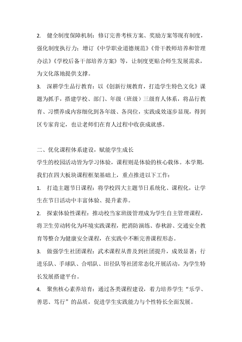 秋季学期中学校长述职述廉报告:以师生发展为核,筑学校优质之基晨晨老师21小时前发布关注私信14.39KB5页0435 以下为资料部分截图预览,下载后为超高清原文件。 第1页 / 共5页 第2页 / 共5页 试读已结束,还剩3页,您可下载完整版后进行离线阅读 加入VIP,享海量教务资料,无限制免费下载所有材料 秋季学期中学校长述职述廉报告:以师生发展为核,筑学校优质之基此内容为付费资源,请付费后查看¥9.9¥15.9VIP会员免费代理(享70%分佣)免费立即购买您当前未登录!建议登陆后购买,可保存购买订单付费资源© 版权声明文章版权归作者所有,未经允许请勿转载。THE END综合资料 文本预览 秋季学期中学校长述职述廉报告:以师生发展为核,筑学校优质之基尊敬的各位领导、老师们:大家好!本学期已近尾声,回望任职以来的历程,自2020年5月担任x中学校长至今,我始终怀揣创业者的憧憬与责任,以“将老师和学生的发展视为根本使命和目标”为初心,带领全校师生探索前行。这五年,有摸索中的困惑,更有成长后的喜悦。实践让我深刻认识到,办好xx中学,需坚守追求卓越的勇气、求真务实的作风、终身学习的习惯与立校为公的品质,唯有凝聚团队共识,以科学、民主、规范的方式推进内涵建设,才能实现学校的优质发展。现将2025年秋季学期述职述廉情况汇报如下:一、深化校园文化建设,筑牢发展灵魂校园文化是学校发展的核心灵魂,承载着全体师生的共同价值追求。在“和谐温馨、科学规范、实践创新”的文化建设目标基础上,本学期我们持续丰富文化内涵、优化落地路径:1.完善教育价值体系:在前期办学理念、培养目标、学风目标的基础上,进一步明确教风和校训,让学校发展方向更清晰,为内涵建设提供坚实框架。 查看更多 收起部分 喜欢就支持一下吧点赞5 分享QQ空间微博QQ好友海报分享复制链接收藏