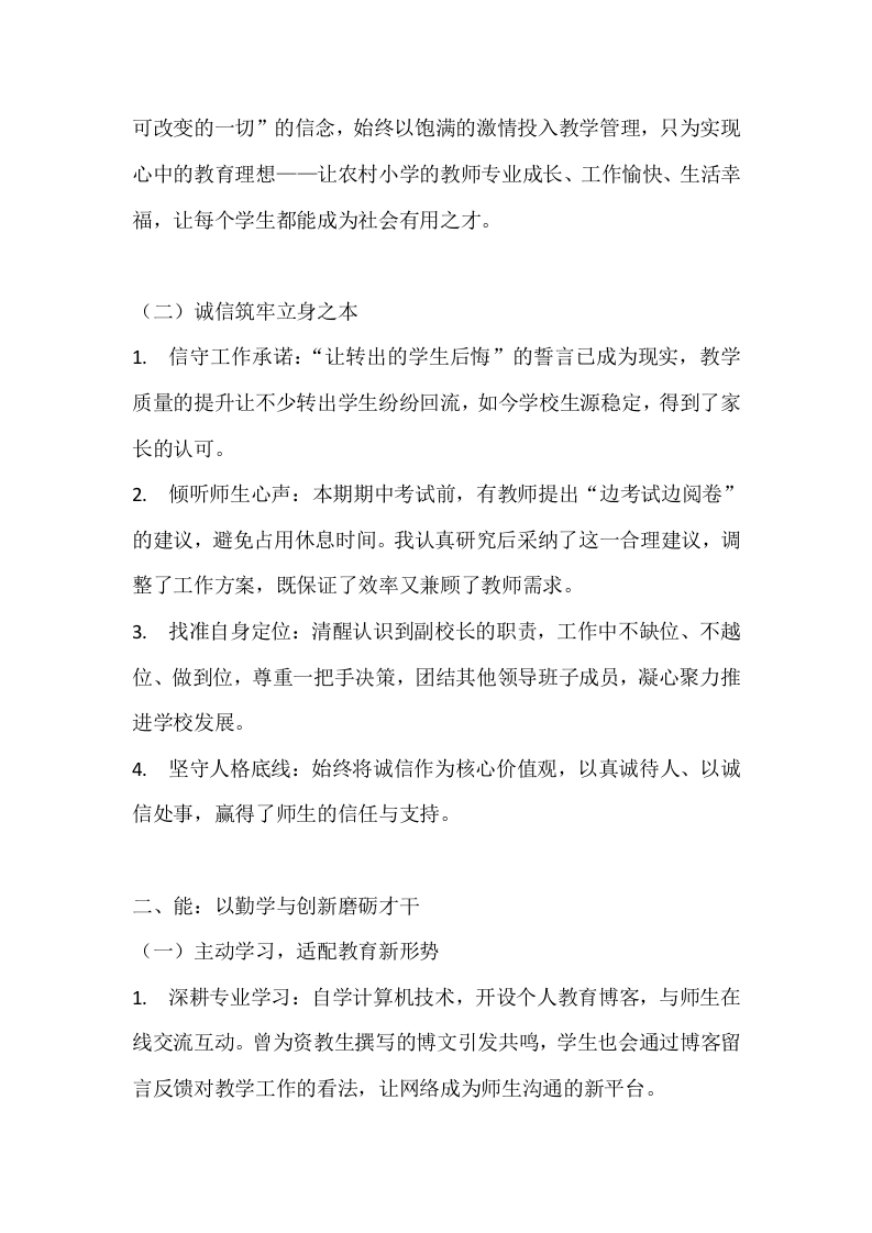 小学副校长2025年秋季学期德能勤绩廉述职报告各位领导、同仁们:大家好!我叫x,现任本校副校长,主管教学工作。接下来,我将从德、能、勤、绩、廉五个方面,汇报2025年秋季学期的履职情况,敬请大家审核指正!我始终信奉一句话:“过去无悔,现在无怨,将来无忧”,这也成为我投身小学教育管理工作的初心与坚守。一、德:以爱心与诚信铸就师魂(一)爱心根植教育情怀1.感恩学校培育:自调入本校工作以来,我见证了学校的成长与发展,也在学校的培养下从普通教师成长为管理者。这份深厚的渊源,让我对学校、对同事们充满感恩,也化为投身工作的不竭动力。2.牵挂学校发展:当学校教学质量面临挑战、学生流失时,我焦虑自责,也曾立下“让转出的学生后悔”的誓言;当学校步入良性发展、教师取得成绩、学生健康成长时,我由衷欣慰;面对个别教师工作懈怠的情况,我虽有愤怒无奈,但批评背后是对学校、对教育的挚爱,也得到了同事们的理解。3.热爱管理工作:秉持“有勇气改变可改变的一切,有胸怀接受不