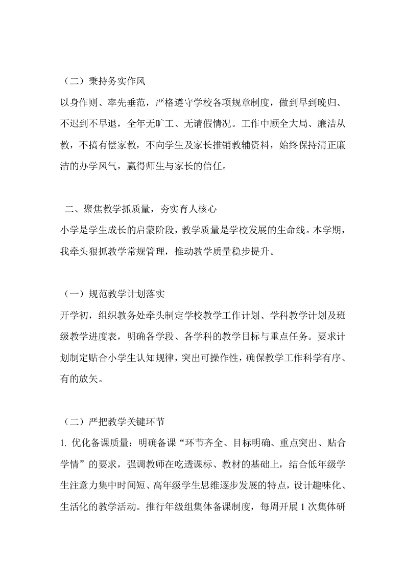 小学教学副校长2025年秋季学期述职报告晨晨老师18小时前发布关注私信20KB6页02615 以下为资料部分截图预览,下载后为超高清原文件。 第1页 / 共6页 第2页 / 共6页 试读已结束,还剩4页,您可下载完整版后进行离线阅读 加入VIP,享海量教务资料,无限制免费下载所有材料 小学教学副校长2025年秋季学期述职报告此内容为付费资源,请付费后查看¥9.9¥15.9VIP会员免费代理(享70%分佣)免费立即购买您当前未登录!建议登陆后购买,可保存购买订单付费资源© 版权声明文章版权归作者所有,未经允许请勿转载。THE END综合资料 文本预览 小学教学副校长2025年秋季学期述职报告尊敬的各位领导、各位老师:大家好!2025年秋季学期,我全面主持学校各项工作,始终坚守“立德树人”根本任务,聚焦小学教育“夯实基础、涵养习惯、激发兴趣”的核心目标,在上级主管部门的指导与全体教职工的同心协力下,有序推进学校管理、教学改革、队伍建设等重点工作,学校发展呈现稳中有进的良好态势。现将本学期工作情况向大家作述职报告,恳请批评指正。一、坚守初心铸师魂,筑牢思想根基作为学校负责人,我始终以共产党员的标准严格要求自己,坚定政治立场,恪守廉洁自律准则,团结班子成员与全体教师,形成干事创业的合力。(一)强化理论学习坚持把思想政治建设摆在首位,组织全体教师按时参加“周一夜学”,深入学习党的二十大及二十届历次全会精神,专题研读《深化新时代基础教育改革总体方案》等政策文件,全年开展集中学习16次,引导教师更新教育理念,筑牢育人思想根基。 查看更多 收起部分 喜欢就支持一下吧点赞15 分享QQ空间微博QQ好友海报分享复制链接收藏