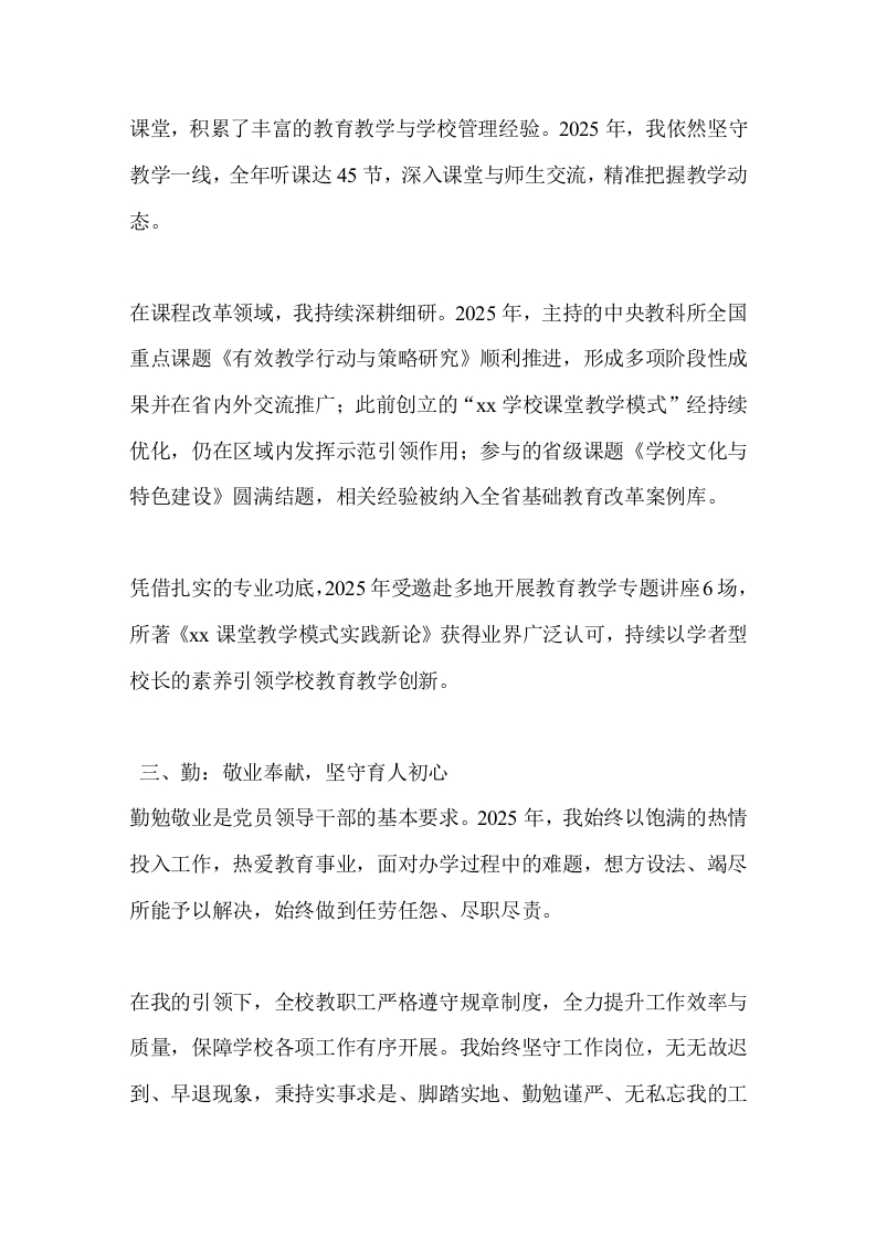 校长2025年度德能勤绩廉述职报告晨晨老师19小时前发布关注私信17.50KB5页02115 以下为资料部分截图预览,下载后为超高清原文件。 第1页 / 共5页 第2页 / 共5页 试读已结束,还剩3页,您可下载完整版后进行离线阅读 加入VIP,享海量教务资料,无限制免费下载所有材料 校长2025年度德能勤绩廉述职报告此内容为付费资源,请付费后查看¥9.9¥15.9VIP会员免费代理(享70%分佣)免费立即购买您当前未登录!建议登陆后购买,可保存购买订单付费资源© 版权声明文章版权归作者所有,未经允许请勿转载。THE END综合资料 文本预览 校长2025年度德能勤绩廉述职报告一年来,我始终秉持“认认真真学习、踏踏实实干事、清清白白为人”的准则,在上级领导的关心指导与全体师生的支持帮助下,认真履行校长职责,坚守教育初心,推动学校各项工作稳步前行。现将本年度德、能、勤、绩、廉五个方面的工作情况述职如下,请予评议。一、德:铸魂育人,筑牢思想根基理论学习是领导干部立身之本、成事之基。2025年,我持续深入学习党的二十大及二十届历次全会精神、习近平新时代中国特色社会主义思想,重点研读关于教育、社会主义核心价值观的重要论述,思想上、行动上始终与党中央保持高度一致。作为教育工作者,我深耕《深化新时代基础教育改革总体方案》等政策文件,深刻领会新时代教育发展方向,进一步坚定了推进教育教学改革的信念。工作中顾全大局、不争名夺利、不计较个人得失,始终以优秀共产党员的标准严格要求自己,在思想、政治、业务上不断完善自我,树立科学发展观、正确政绩观和牢固群众观,全心全意为学校发展、为师生成长尽职尽责。二、能:深耕实践,提升履职效能深耕教育战线30余年,我从一线教师到学校管理者,始终未脱离教学 查看更多 收起部分 喜欢就支持一下吧点赞15 分享QQ空间微博QQ好友海报分享复制链接收藏