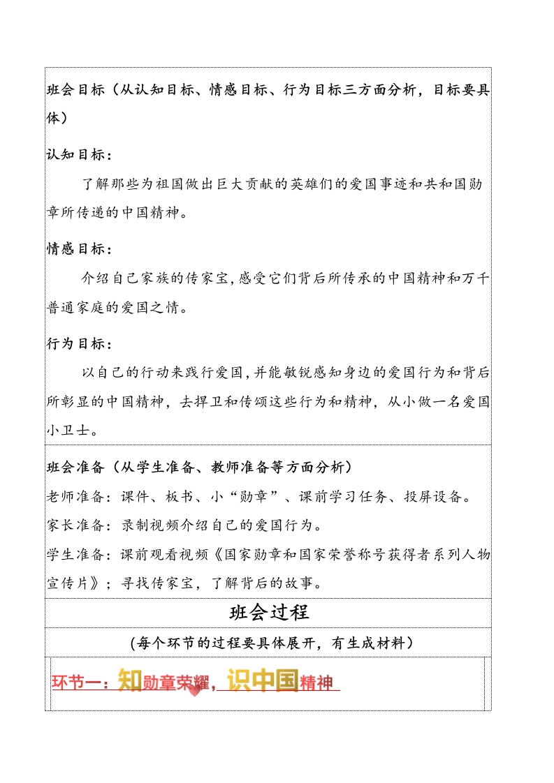 一件传家宝,一脉中国情,班会教案晨晨老师前天发布关注私信2.02MB17页02215 以下为资料部分截图预览,下载后为超高清原文件。 第1页 / 共17页 第2页 / 共17页 试读已结束,还剩15页,您可下载完整版后进行离线阅读 加入VIP,享海量教务资料,无限制免费下载所有材料 一件传家宝,一脉中国情,班会教案此内容为付费资源,请付费后查看¥9.9¥15.9VIP会员免费代理(享70%分佣)免费立即购买您当前未登录!建议登陆后购买,可保存购买订单付费资源© 版权声明文章版权归作者所有,未经允许请勿转载。THE END综合资料 文本预览 1.孩子们大多能讲述几个爱国故事,但讲解的内容聚焦在大人物的大贡献上,对普通民众的爱国行为缺少相应的关注和感悟。2.绝大部分孩子有意愿接受和参与爱国主义教育活动,只是平时将大部分精力用在学习上,认为爱国是特定时间特定地点的所作所为,对爱国的理解还比较浅显。3.最受孩子们欢迎的爱国主义教育形式是游戏类、互动类的活动和实践活动。4.三年级的孩子们,对于自己应该如何用实际行动践行爱国,他们知道的不是很多。主题分析:“一家仁,一国兴仁;一家让,一国兴让。”《新时代爱国主义教育实施纲要》指出,爱国主义是中华民族的民族心、民族魂,是中华民族最重要的精神财富。《中小学德育工作指南》中要求学校在开展德育教育活动时要符合中小学生的年龄特点、认知规律和教育规律,注重学段衔接和知行统一,强化道德实践、情感培育和行为习惯养成,并增强德育工作的吸引力、感染力和针对性、实效性。同时,要坚持协同配合,发挥学校主导作用,引导家庭、社会增强育人责任。结合上述文件要求,本次班会课以“爱国主义教育”为主题,立足于三年级孩子的身心发展情况和我班实际情况,讲述传家宝的“传承”故事。把班会课的主动权还给学生,让他们通过寻找自己家族的“传家宝”和身边的爱国事迹,获得对何为爱国的深刻收获和体验。 查看更多 收起部分 喜欢就支持一下吧点赞15 分享QQ空间微博QQ好友海报分享复制链接收藏