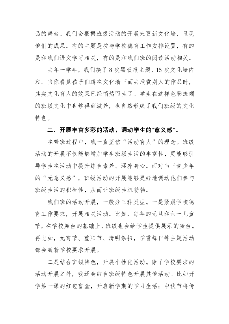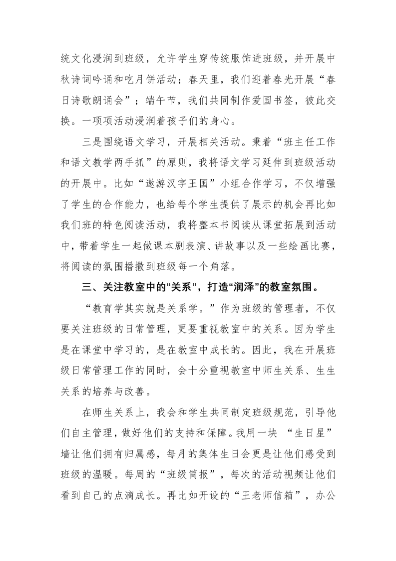 【班主任】工作经验分享PPT:于细微处开出“班级管理之花”讲稿晨晨老师前天发布关注私信0.31MB5页03011 以下为资料部分截图预览,下载后为超高清原文件。 第1页 / 共5页 第2页 / 共5页 第3页 / 共5页 试读已结束,还剩2页,您可下载完整版后进行离线阅读 加入VIP,享海量教务资料,无限制免费下载所有材料 【班主任】工作经验分享PPT:于细微处开出“班级管理之花”讲稿此内容为付费资源,请付费后查看¥9.9¥15.9VIP会员免费代理(享70%分佣)免费立即购买您当前未登录!建议登陆后购买,可保存购买订单付费资源© 版权声明文章版权归作者所有,未经允许请勿转载。THE END综合资料 文本预览 2025年优秀班主任工作经验分享(于细微处开出“班级管理之花”)今天我要分享的班主任工作经验不是很“轰轰烈烈”,而是一些在细微处的思考与做法。因为一说到班主任工作,其实大家都很头疼。事情多,很琐碎,一个接着一个,还充满了太多的突发性。那么,如何在这样琐碎的工作中有效地开展班级管理工作,甚至是形成自己的带班特色呢,我有几个小做法与大家分享。一、借助班级环境创设,凝聚班级“场能量”。一个好的班级管理者,一定是注重班级文化建设的。因为好的班级文化建设能够凝聚班级力量,涵养学生身心。在我的带班管理中,我也十分注重班级的环境创设,针对我的教室,我重点抓班级的图书角、黑板报和文化墙这三个方面。因为阅读文化是我们班级的特色,图书角的建设也一直是我的重点工作。每学期初,我都会带领学生建设图书角,并将阅读文化真切的带到他们身边。黑板报我每个月会换一次主题,基本是跟着学校的安排来定,有时也会根据班级活动来调整。比如,我利用家长会开展的“民间故事”绘画比赛,就是将作品张贴在黑板报和文化墙上的来供家长和学生投票的。文化墙创设是我们班的特点。更新的频率比较高,因为我们班的文化墙已经不再只是文化墙,而是每个学生呈现作 查看更多 收起部分 喜欢就支持一下吧点赞11 分享QQ空间微博QQ好友海报分享复制链接收藏
