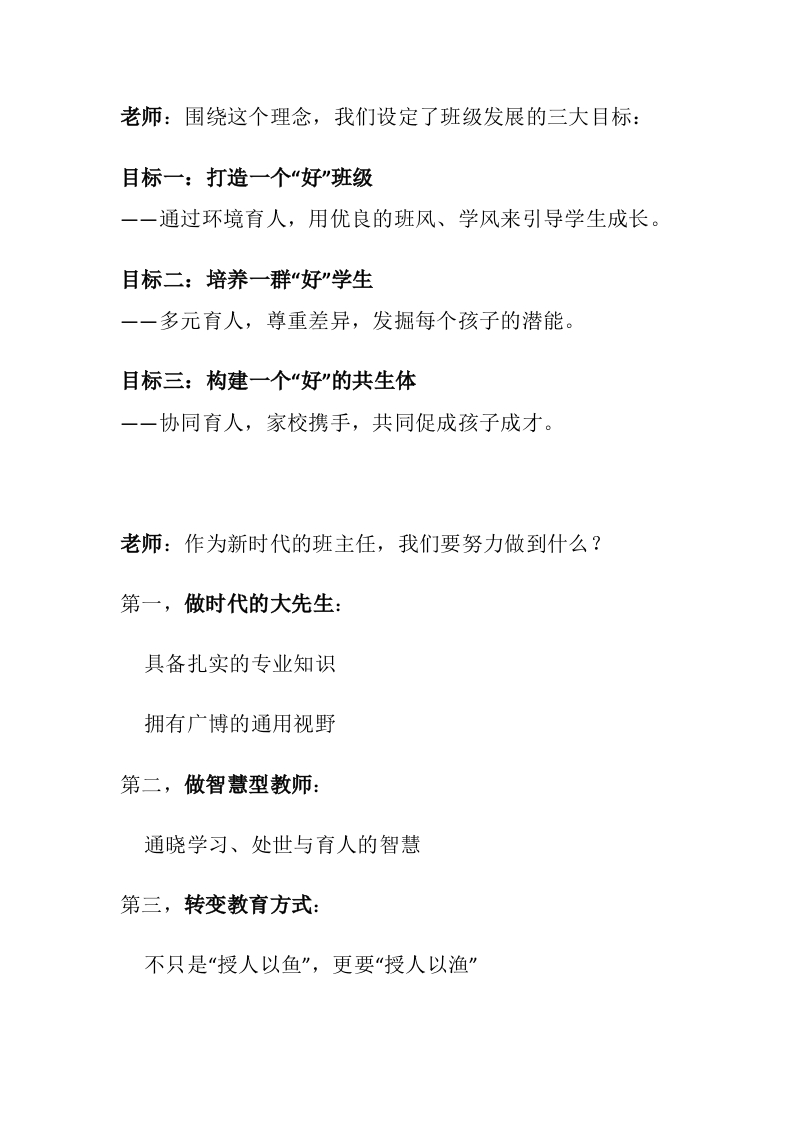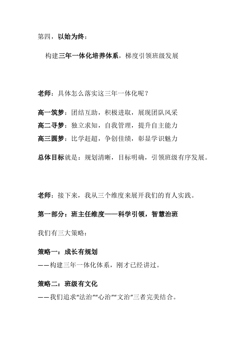 【高中】【育人方略】班主任带班育人方略:春生万物,不分稻稗讲稿晨晨老师前天发布关注私信17.60KB8页0415 以下为资料部分截图预览,下载后为超高清原文件。 第1页 / 共8页 第2页 / 共8页 第3页 / 共8页 试读已结束,还剩5页,您可下载完整版后进行离线阅读 加入VIP,享海量教务资料,无限制免费下载所有材料 【高中】【育人方略】班主任带班育人方略:春生万物,不分稻稗讲稿此内容为付费资源,请付费后查看¥9.9¥15.9VIP会员免费代理(享70%分佣)免费立即购买您当前未登录!建议登陆后购买,可保存购买订单付费资源© 版权声明文章版权归作者所有,未经允许请勿转载。THE END综合资料 文本预览 逐字稿:《高中班主任带班育人方略》老师:各位老师、同仁,大家好!今天我要分享的主题是一一《高中班主任带班育人方略》。我的核心思想就八个字:春生万物,不分稻稗。什么意思呢?春天来了,万物生长,不会因为你是稻谷就多给你阳光,也不会因为你是稗草就剥夺你生长的权利。每个生命都值得被尊重,每个学生都有成长的可能。老师:这份育人方略,是在2025年12月整理完成的。我们的核心理念就是刚才说的一一“春生万物,不分稻稗”,尊重个体差异。育人目标很明确:坚持立德树人,促进学生全面发展与多元成才。愿景使命是:尊重生命个体,助力每一位学生成就最好的自己。而要实现这一切,我们的总体策略是:构建班主任、学生、家长三维协同育人体系。 查看更多 收起部分 喜欢就支持一下吧点赞5 分享QQ空间微博QQ好友海报分享复制链接收藏