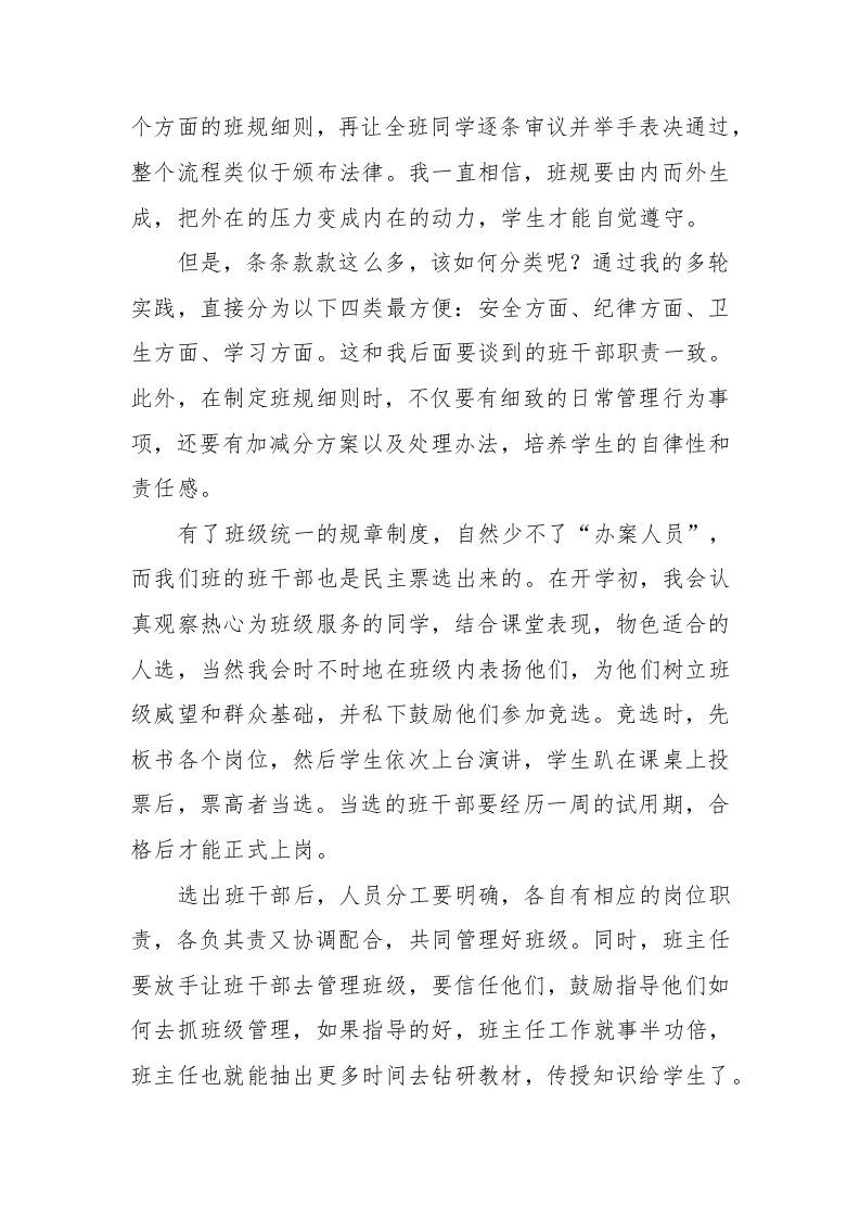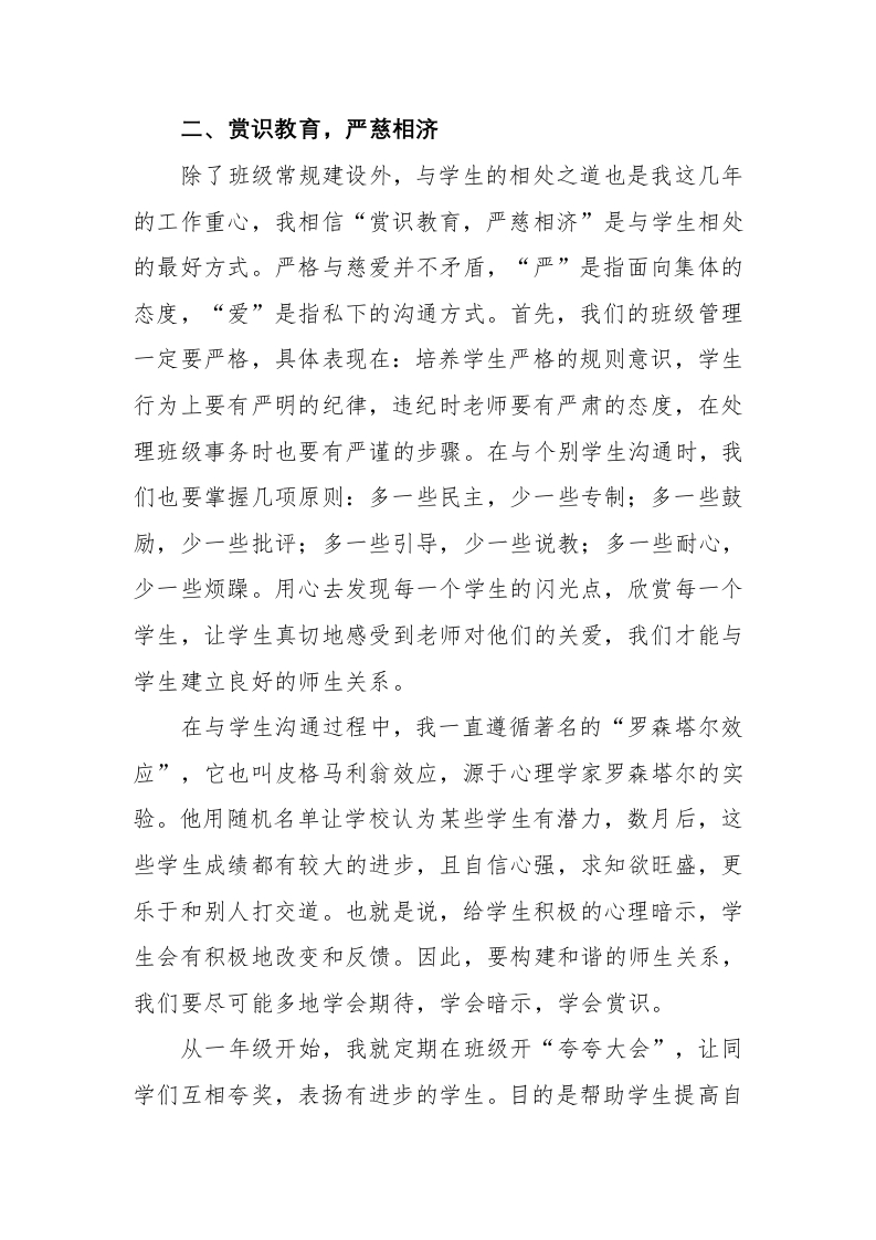 【小学】【班主任】经验分享PPT:亦师亦友伴花开讲稿晨晨老师前天发布关注私信0.31MB6页0249 以下为资料部分截图预览,下载后为超高清原文件。 第1页 / 共6页 第2页 / 共6页 第3页 / 共6页 试读已结束,还剩3页,您可下载完整版后进行离线阅读 加入VIP,享海量教务资料,无限制免费下载所有材料 【小学】【班主任】经验分享PPT:亦师亦友伴花开讲稿此内容为付费资源,请付费后查看¥9.9¥15.9VIP会员免费代理(享70%分佣)免费立即购买您当前未登录!建议登陆后购买,可保存购买订单付费资源© 版权声明文章版权归作者所有,未经允许请勿转载。THE END综合资料 文本预览 2025年小学班主任工作经验分享(亦师亦友伴花开一束微光渐斑斓)大家好!我是秦老师,今天我作为班主任进行经验交流。我的交流谈不上什么经验交流,更多的是关于这几年班主任经历的工作汇报,粗浅地谈一谈班主任工作中的点滴做法。在过去,班主任可能是教书匠、园丁,他们只是知识的灌输者和传道者,而现在,我们不仅要完成教学工作,还要充当心灵导师、调解员、警察、法官、保姆、知心姐姐等角色。因此,如何在新时代做一位能胜任的班主任呢?今天我将从以下三点来分享我的经验。一、严明制度,自主管理二、赏识教育,严慈相济三、家校齐心,师生同行一、严明制度,自主管理一年级时,学生们处于一个试错的阶段,在老师的引导下,逐渐知道什么事情能做,什么事情不能做,建立了初步的班级纪律和规矩。到了二年级,我们学到了“不以规矩,不能成方圆。”在理解这句名言时,我就顺势带领同学们一起制定了班规。到了四年级上学期,我上道德与法治第二课《我们的班规我们订》,又和同学们一起完善了我们的班规,增加了更多的细则。在制约性、广泛性、可操作性的原则下,分小组讨论各 查看更多 收起部分 喜欢就支持一下吧点赞9 分享QQ空间微博QQ好友海报分享复制链接收藏