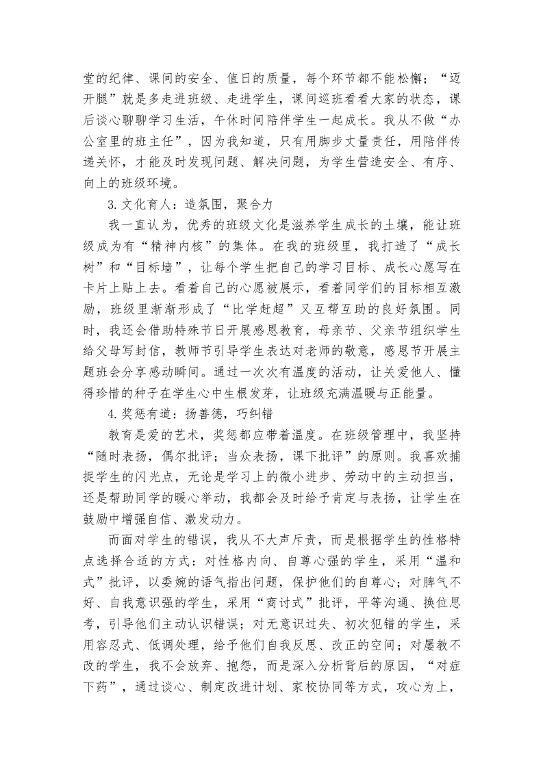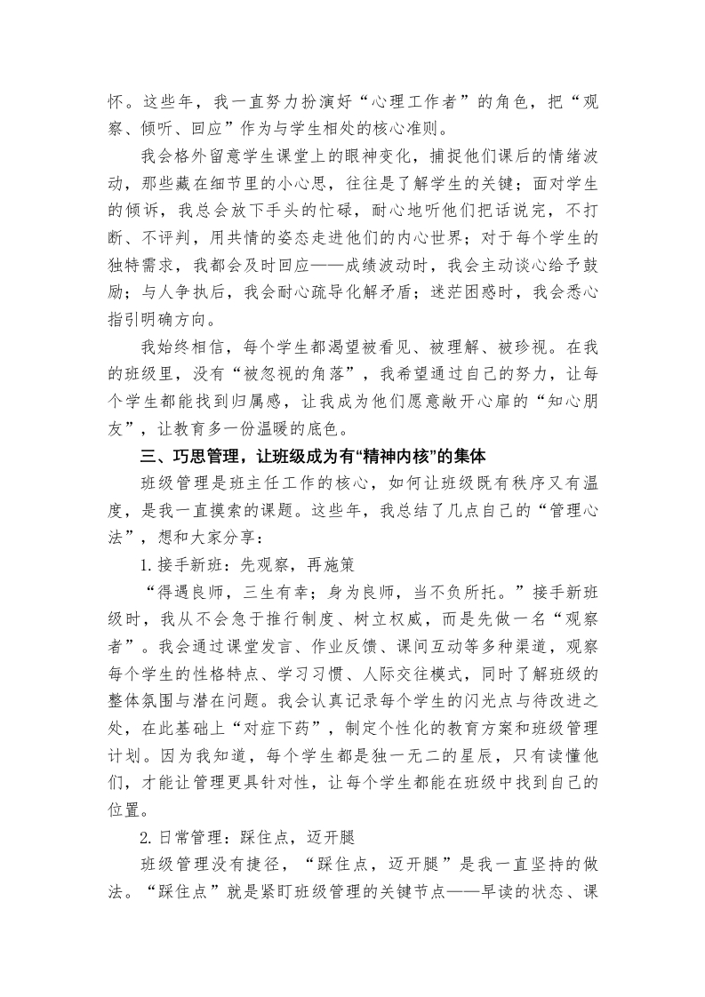 【育人方略】班主任工作经验分享:在摸索中成长,在成长中摸索讲稿晨晨老师前天发布关注私信17.63KB5页02214 以下为资料部分截图预览,下载后为超高清原文件。 第1页 / 共5页 第2页 / 共5页 第3页 / 共5页 试读已结束,还剩2页,您可下载完整版后进行离线阅读 加入VIP,享海量教务资料,无限制免费下载所有材料 【育人方略】班主任工作经验分享:在摸索中成长,在成长中摸索讲稿此内容为付费资源,请付费后查看¥9.9¥15.9VIP会员免费代理(享70%分佣)免费立即购买您当前未登录!建议登陆后购买,可保存购买订单付费资源© 版权声明文章版权归作者所有,未经允许请勿转载。THE END综合资料 文本预览 在摸索中成长,在成长中摸索一一我的班主任工作经验分享孔子说“知之者不如好之者,好之者不如乐之者”,这不仅是我对教育的理解,更是我多年班主任工作的初心指引。在我看来,班主任既是教育型的管理者、学习的指导者,也是学生平等的对话者、同行的学习者,更是心理工作者、家庭教育的指导者。多重角色的背后,是一场在摸索中前行、在成长中沉淀的漫长修行。一、深耕专业,做学生的“靠谱引路人”我始终坚信,扎实的专业功底是赢得学生信任的基础。管理是外在的要求,而专业能力的感染才是内在的唤醒。作为老师,我们要给学生一碗水,自己得有一桶水,甚至是一条奔流不息的河。所以这些年,我一直把自我提升当作常态化的工作:我会不断更新知识储备,提高专业技能,及时丰富自己的教育教学经验和班级管理经验;会主动学习新的教育理念,并用这些理念来指导自己的日常教学实践;更会珍惜每一次学习机会一一从教育理论书籍中汲取养分,在课堂实践中总结得失,向身边经验丰富的同事虚心请教,在自我反思中优化教育方法。这些年,我先后参加了学科网主办的多场培训:2023年8月的“全国中小学校暑期强师计划专题云端研讨会”,14学时的系统学习让我对暑期育人有了新的思考;2024年10月的“全国班主任大会”,20学时的深耕夯实了我的班级管理功底;同年11月的“教师专业发展大会”,15学时的充电让我的教学能力再获提升;2025年8月的“暑期强师计划”和10月的“全国班主任大会”,又让我在14学时和27学时的深度学习中,收获了更多前沿的教育理念和实用方法。一张张证书不仅是学习时长的证明,更是我专业成长的足迹。我始终觉得,只有自己专业过硬,才能成为学生成长路上真正“靠谱”的引路人。二、共情倾听,做学生的“知心朋友”在我看来,教育不仅是知识的传递,更是心灵的唤醒。作为班主任,我们心中既要装有浩瀚的知识,更要装满对学生的牵挂与关 查看更多 收起部分 喜欢就支持一下吧点赞14 分享QQ空间微博QQ好友海报分享复制链接收藏