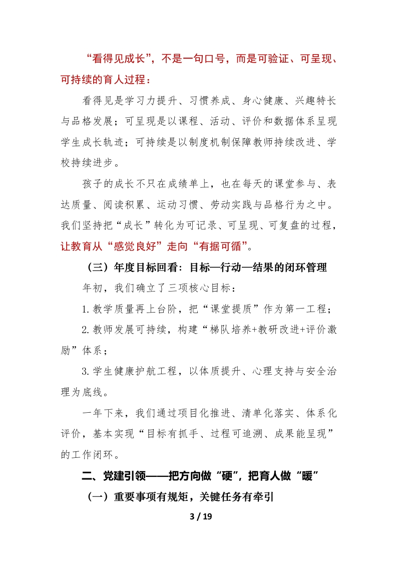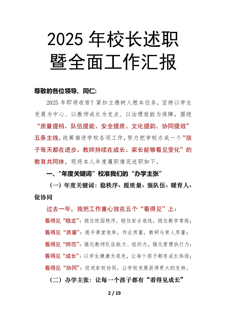 2025年度小学校长述职暨全面工作汇报PPT:把一所学校办成“看得见成长”的地方讲稿晨晨老师前天发布关注私信0.52MB19页0396 以下为资料部分截图预览,下载后为超高清原文件。 第1页 / 共19页 第2页 / 共19页 第3页 / 共19页 试读已结束,还剩16页,您可下载完整版后进行离线阅读 加入VIP,享海量教务资料,无限制免费下载所有材料 2025年度小学校长述职暨全面工作汇报PPT:把一所学校办成“看得见成长”的地方讲稿此内容为付费资源,请付费后查看¥9.9¥15.9VIP会员免费代理(享70%分佣)免费立即购买您当前未登录!建议登陆后购买,可保存购买订单付费资源© 版权声明文章版权归作者所有,未经允许请勿转载。THE END综合资料 文本预览 把一所学校办成“看得见成长”的地方2025年校长述职暨全面工作汇报目录一、“年度关键词”校准我们的“办学主张”二、党建引领一—把方向做“硬”,把育人做“暖”三、教学质量的底线一一让课堂更有效,让学习更真实四、教师队伍一一让专业成长有路径、有舞台、有荣誉五、学生成长一—把“五育并举”做成看得见的成长曲线六、安全与治理一一把校园运行做成“可控、可视、可追溯”七、协同育人一一让家校社从“配合”走向“共育八、硬件建设一一让每一笔投入都指向学生受益九、年度亮点与成果,呈现学校的进步十、问题清单与复盘一一不回避短板,用整改兑现承诺十一、2026行动一一用“三张表”把计划讲清楚、做扎实把一所学校办成“看得见成长”的地方1/19 查看更多 收起部分 喜欢就支持一下吧点赞6 分享QQ空间微博QQ好友海报分享复制链接收藏