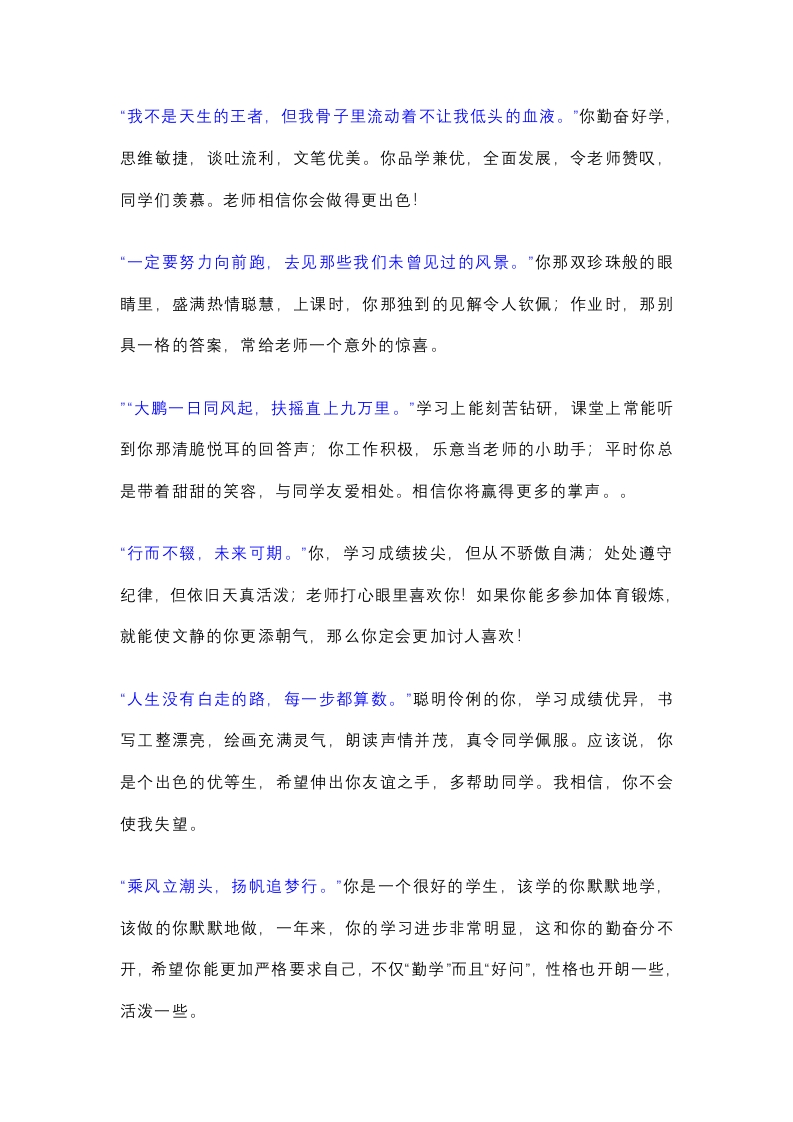 班主任《期末评语》大全(人民日报版)晨晨老师2个月前发布关注私信0.75MB15页06713 以下为资料部分截图预览,下载后为超高清原文件。 第1页 / 共15页 第2页 / 共15页 试读已结束,还剩13页,您可下载完整版后进行离线阅读 加入VIP,享海量教务资料,无限制免费下载所有材料 班主任《期末评语》大全(人民日报版)此内容为付费资源,请付费后查看¥9.9¥15.9VIP会员免费代理(享70%分佣)免费立即购买您当前未登录!建议登陆后购买,可保存购买订单付费资源© 版权声明文章版权归作者所有,未经允许请勿转载。THE END班级管理 文本预览 72份人民日报期末学生评语不重复人民阳软期末评语RENMIN RIBAC送给表现一直很优秀的同学“当一个人踮起脚尖靠近太阳的时候,全世界都挡不住他的阳光。"你踏踏实实,一丝不苟,勤奋刻苦,学习成绩上总会有一鸣惊人之举。愿你在以后的学习中像太阳一般激情似火,光芒万丈!“当你在追光,你与光同航。”你是一个聪明有个性的孩子,每天努力学习,力求超越自己。你的认真,你的执着为你开创出一条通往成功的道路。愿你在新的一年中更加努力,取得更加骄人的成绩。“你的未来藏在你现在的努力里。”你是个认真负责的课代表,每天做好自己的本职工作,上课认真听讲,做好笔记,那专心致志的神情令老师感动。愿你在新学期中快乐地学习,取得更好的成绩。“书痴者文必工,艺痴者技必良;有恒者不声张,功成时美名扬。”你是个很上进的孩子,学习上勤奋刻苦,毫不懈怠。你用汗水浇灌出成功之花,用努力铺就通往未来的道路。 查看更多 收起部分 喜欢就支持一下吧点赞13 分享QQ空间微博QQ好友海报分享复制链接收藏