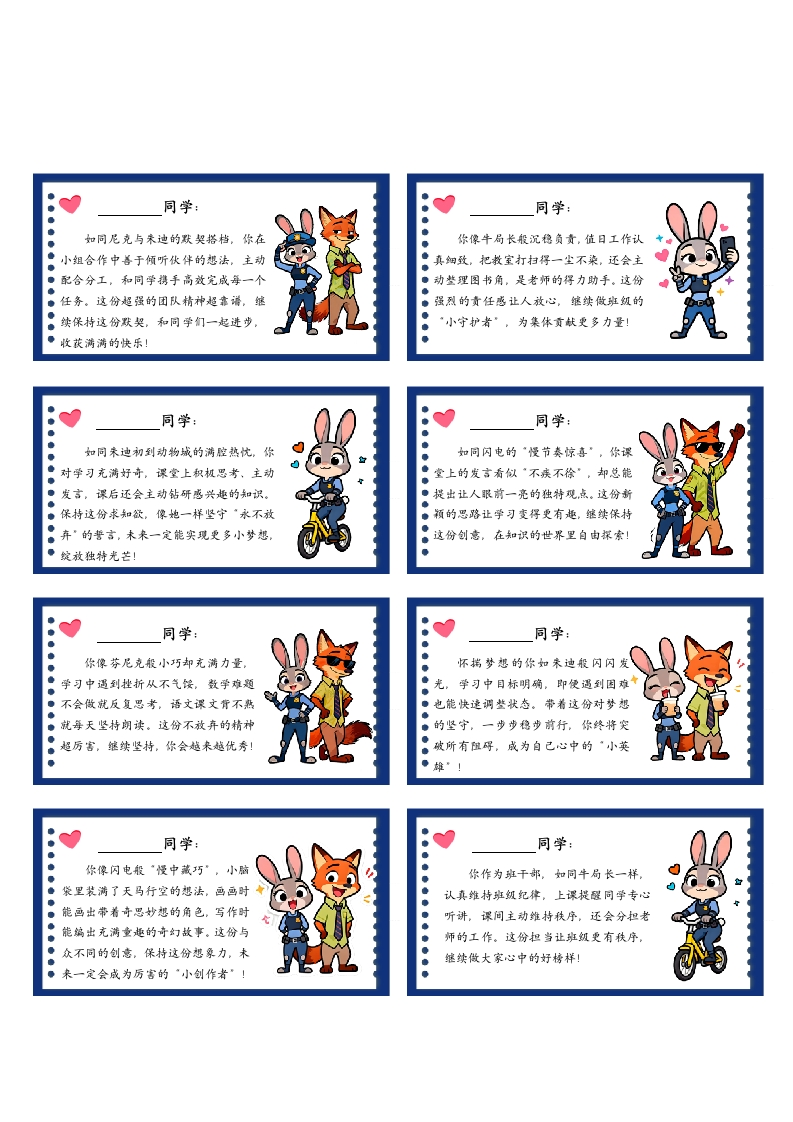 疯狂动物城评语64则晨晨老师2个月前发布关注私信5.33MB8页0616 以下为资料部分截图预览,下载后为超高清原文件。 第1页 / 共8页 第2页 / 共8页 试读已结束,还剩6页,您可下载完整版后进行离线阅读 加入VIP,享海量教务资料,无限制免费下载所有材料 疯狂动物城评语64则此内容为付费资源,请付费后查看¥9.9¥15.9VIP会员免费代理(享70%分佣)免费立即购买您当前未登录!建议登陆后购买,可保存购买订单付费资源© 版权声明文章版权归作者所有,未经允许请勿转载。THE END班级管理 文本预览 同学:同学●●●你像米迪怀揣警察梦般坚定执着:上课专注、作业认真,你用自律展现学习中敢挑战难题、主动会试。从不因了优秀的学习态度。像米迪对待工作一样●●挫折退缩。这份冲破“兔子不能当警察●严谨,你对待每一个知识点都认真掌握。●。的身气超亮眼,愿你带着这份热情全力●从不最衍了事。这份态度让你基础扎实。奔跑,在成长路上突破自我局限,收花●。进步飞快。继续保持这份自律,你会越来●属于自己的·动物城奇迹”!●越棒!●同学:●同学:●你像尼克般温暖真诚。总能用善意打你有着闪电般的“反差萌”,手工、●动身边的同学,同学有因难时主动伸出援绘画作品充满童真与巧思。你做的动物●手,帮伙件讲随、分担任务,是班级里的●城模型相相如生,画的卡通角色可爱灵●·小太阳”。保持这份珍贵的友善。你会。动,每一件作品都别具特色。继续发挥。收花更多真挚的友谊,让集体充满温暖与超强的动手能力。成为班级里的“小艺爱!●●术家!同学::同学:你像牛局长般沉稳负责,值日工如同尼克与来迪的默契搭档你●作认真细致,把教宝打扫得一尘不染在小组合作中善于倾听伙件的慈法,●●还会主动整理图书角,是老师的得力●主动配合分工,和同学携手高放完成●助手。这份强烈的真任感让人放心每一个任务。这份超强的团队精神超。继续做班级的“小守护者”,为集体●靠谱,继续保持这份默契,和同学们●贡献更多力量!●一起进步,收茂满满的快乐!●同学:同学::●你有着闪电般的“独特燃力”。解决数学难题时能想到新额的解题:你的小脑袋里。藏着一个比动物城更奇妙的世界!课堂发言时的奇思炒想,●思路,做手工时能把普通材料变成精画画、写作中的创恋表达,都像闪电的●致的作品。这份超强的创造力让你脱“慢节奏幽默”一样充满惊喜。保持这●颖而出,继续在创意的海洋中尽情逃份想象力,未来一定会绽放独特光芒」●游 查看更多 收起部分 喜欢就支持一下吧点赞6 分享QQ空间微博QQ好友海报分享复制链接收藏
