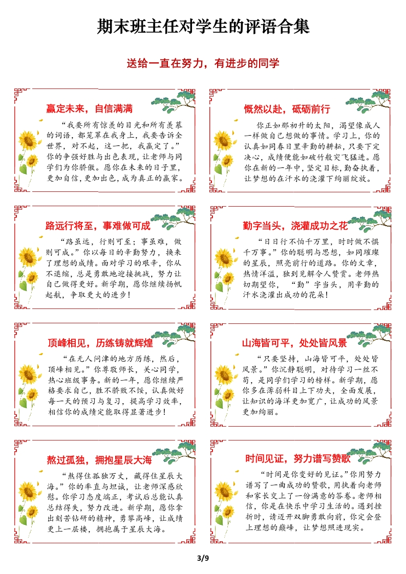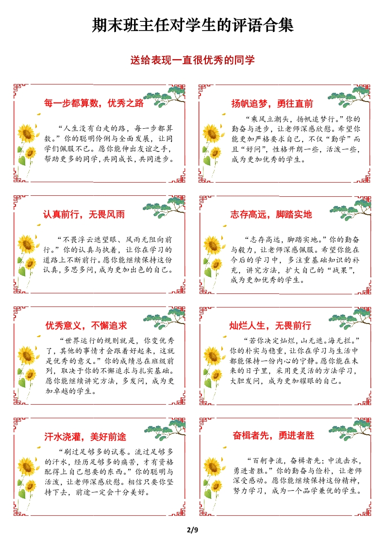 期末班主任对学生的评语合集(美化版)晨晨老师2个月前发布关注私信0.24MB9页012611 以下为资料部分截图预览,下载后为超高清原文件。 第1页 / 共9页 第2页 / 共9页 第3页 / 共9页 试读已结束,还剩6页,您可下载完整版后进行离线阅读 加入VIP,享海量教务资料,无限制免费下载所有材料 期末班主任对学生的评语合集(美化版)此内容为付费资源,请付费后查看¥9.9¥15.9VIP会员免费代理(享70%分佣)免费立即购买您当前未登录!建议登陆后购买,可保存购买订单付费资源© 版权声明文章版权归作者所有,未经允许请勿转载。THE END班级管理 文本预览 班主任对学生的评语合集送给表现一直很优秀的同学呢追光而行,光芒万丈与光同航,超越自我“当一个人踮起脚尖靠近太阳的时“当你在追光,你与光同航。”你的候,全世界都挡不住他的阳光。”你以智慧与个性如同璀璨的星辰,每天的学踏实勤奋的姿态,一丝不苟地耕耘着学习之旅都是对自我的超越。你的认真与习的田野,每一次的成绩飞跃都是对你执着,已为你铺设了一条通往梦想的道努力的最好证明。愿你在未来的日子路。新的一年,愿你乘风破浪,再创辉里,如太阳般激情四射,光芒照耀四方。煌。努力当下,未来可期勤奋浇灌,成功之花“你的未来藏在你现在的努力里。”“书痴者文必工,艺痴者技必良;作为课代表,你尽职尽责,课堂上的专有恒者不声张,功成时美名扬。”你的注令人动容。愿你在新学期中,以更加勤奋与努力,如同细雨滋润着知识的土饱满的热情,拥抱学习的快乐,收获更壤,终将绽放出最灿烂的成功之花。愿加丰硕的果实。你在未来的道路上,继续以汗水浇灌梦想。nn骨子里的坚韧,不凡的你独到见解,意外惊喜“我不是天生的王者,但我骨子里“一定要努力向前跑,去见那些我流动着不让我低头的血液。”你的勤奋、们未曾见过的风景。”你那充满热情与聪明与才华,让老师与同学们赞叹不智慧的眼睛,总能在课堂上带来独到的已。愿你在未来的日子里,更加自信,见解,给老师带来意外的惊喜。愿你在更加出色,成为更加耀眼的星辰。学习的道路上,继续奔跑,探索更多未知的风景。nEn大鹏展翅,扶摇直上行而不辍,朝气蓬勃“大鹏一日同风起,扶摇直上九万“行而不辍,未来可期。”你的优秀里。”你的勤奋与才华,如同大鹏展翅,与努力,让老师打心眼里喜欢你。若能即将翱翔于九天之上。愿你在未来的日在学习之余,多参加体育锻炼,相信你子里,更加勇敢,更加坚强,赢得更多会更加朝气蓬勃,更加讨人喜欢。的掌声与喝彩。1/9 查看更多 收起部分 喜欢就支持一下吧点赞11 分享QQ空间微博QQ好友海报分享复制链接收藏