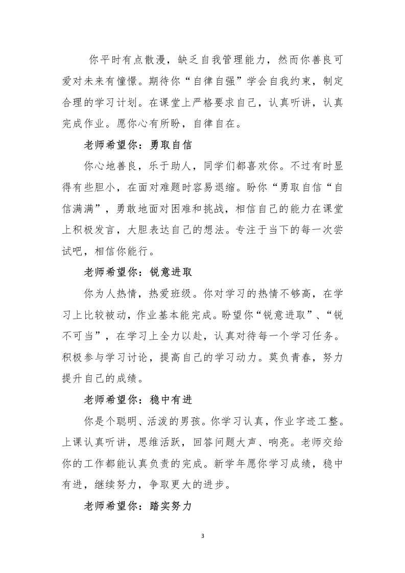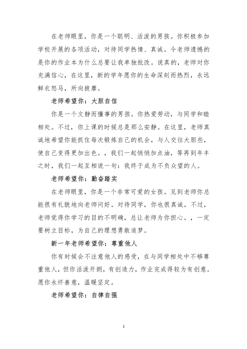 2025《期末评语》有评价、有建议、有希望、也要有祝福!晨晨老师2个月前发布关注私信23.02KB6页05815 以下为资料部分截图预览,下载后为超高清原文件。 第1页 / 共6页 第2页 / 共6页 第3页 / 共6页 试读已结束,还剩3页,您可下载完整版后进行离线阅读 加入VIP,享海量教务资料,无限制免费下载所有材料 2025《期末评语》有评价、有建议、有希望、也要有祝福!此内容为付费资源,请付费后查看¥9.9¥15.9VIP会员免费代理(享70%分佣)免费立即购买您当前未登录!建议登陆后购买,可保存购买订单付费资源© 版权声明文章版权归作者所有,未经允许请勿转载。THE END综合资料 文本预览 2025期末评语有评价、有建议、有希望、也要有祝福!老师希望你:大胆自信文静,是你美好的气质;朴实,是你优秀的品格;勤恳,是你良好的学习习惯。虽然你平时话不多,但你有辨别是非的能力;如果你能在各方面大胆活泼些,就更棒了!,愿你有始料未及的运气,也有突如其来的欢喜,愿你所见皆为美好,所行不负年少。老师希望你:奋勇前进你是一个斯斯文文的男孩。上课能认真听讲,积极思维。不过,老师觉得你学习目的不明确,总让老师为你担心。说真的,老师对你充满信心。求学路漫漫其修远兮,任重而道远,在新的学年里,愿你走完山水万程,仍与理想重逢。老师希望你:更进一步想到你,浮现在我眼前的是你对班级工作认真负责的情景。能出色完成老师交给你的各项任务,当好老师的小助手。在这里,老师送你一句话:“学无止境,只要不断拼搏,就能获得更大丰收。”世界上有一千种等待,最好的那种叫做未来可期!老师希望你:勤学苦练 查看更多 收起部分 喜欢就支持一下吧点赞15 分享QQ空间微博QQ好友海报分享复制链接收藏