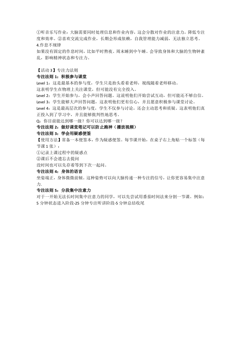 学习班会:四十分钟的逆袭“专注力加油站”一学习班会-X三班出品一、教学目标1、知识与技能目标学生能够通过“一分钟专注挑战”实践,亲身体验并准确识别在专注过程中干扰自身的因素,如思维飘移、外部环境干扰等,分析这些因素对专注效果的具体影响,从而为后续改进提供靶向依据。2、过程与方法目标借助“一分钟专注挑战”以及对课堂参与情况的回顾,学生学会静下心来,以客观、理性的态度对自己在专注过程中的表现进行深度反思和细致分析,找出自身专注力提升的关键突破点,培养自我觉察和自我诊新的能力,为后续制定个性化改进计划提供精准定位。以“专注力法则”为行动指南,学生能够在日常学习场景中主动尝试运用所学法则,如积极参与课堂互动、做好笔记、使用疑惑便签、调整身体姿态、采用番茄时间法等,通过不断实践,积累运用法则的经验,提高解决实际学习中专注力问题的实操能力,逐步摸索出一套适合自己的专注力提升策略组合。3、情感态度与价值观目标通过课程学习,学生深刻认识到专注力在学习和个人成长中的关键作用,专注力不再是一个抽象的概念,而是与自身成绩提升、知识掌握、目标实现紧密相连的重要素质,从而在内心深处树立起强化专注力的强烈意识,将提升专注力视为自我发展的内在需求,而非外部强加的任务。二、教学过程【导入】上课时会有这样的情况吗?现在请你伸出一只手,如果曾出现过以下情况,请弯曲一根手指。EP01.上课时,我会忽然想起之前的某件事。EP02.老师提问时,我有时不清楚在讲哪一道题EP03.我会忍不住地看时间,计算多久下课EP04.我会在上课时偷偷将零食放进嘴里。EP05.我会在课本下或抽屉里藏一本回家作业,趁机上课写作业。【活动1】一分钟专注挑战每位学生准备一张白纸和一支笔。现在会播放一段轻柔的背景音乐,你需要在1分钟内尽可能多地写下数字1-100。时间到后,检查数字是否连续且无重复写得最多且无错误的同学获胜。思考:在此过程中什么干扰了你?【活动2】专注力培养的坏习惯清单1.频繁使用电子产品短暂多巴胺的刺激,会让我们习惯于快速切换注意力,从而难以长时间专注于一件事情。2.缺乏自我约束在学习或做事情时,不能很好地控制自己的行为,比如晚自习喜欢随意走动、借东西、问作业、东张西望,或者频繁变换活动内容,这些都会削弱你的专注力。3.一些干扰大脑认知的行为