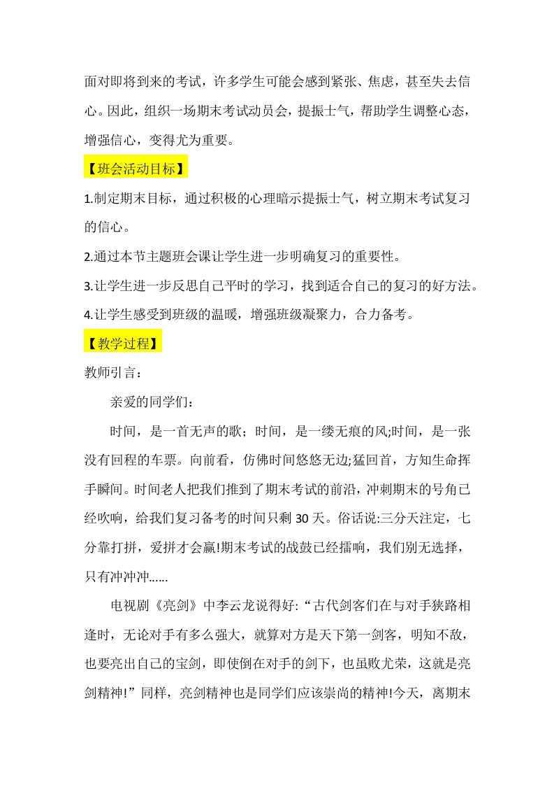 心中藏丘壑下笔绘山河:期末考试备考动员主题班会讲稿晨晨老师2个月前发布关注私信0.25MB14页04913 以下为资料部分截图预览,下载后为超高清原文件。 第1页 / 共14页 第2页 / 共14页 第3页 / 共14页 试读已结束,还剩11页,您可下载完整版后进行离线阅读 加入VIP,享海量教务资料,无限制免费下载所有材料 心中藏丘壑下笔绘山河:期末考试备考动员主题班会讲稿此内容为付费资源,请付费后查看¥9.9¥15.9VIP会员免费代理(享70%分佣)免费立即购买您当前未登录!建议登陆后购买,可保存购买订单付费资源© 版权声明文章版权归作者所有,未经允许请勿转载。THE END综合资料 文本预览 心中藏丘壑,下笔绘山河2025年期末备考主题班会课件逐字稿释义:只有少年心中具备广阔的胸怀和深远的见识,才能在创作中展现出壮丽的山河景象。赏析:这句话的意境深远,不仅可以用于目前众多莘莘学子备考心态的要求,也是对个人胸怀和见识的期望和赞美,鼓励学子们在面对挑战时保持宽广的胸怀和深远的见识。期末考试不仅是对同学们一个学期以来学业成果的一次盘点,更是对每个人综合素质的一次挑战,是对同学们自信心、自觉性、意志力的一次考验,也是同学们对老师辛勤工作予以回报的时刻:希望同学们克服过于紧张、焦虑的情绪,沉着冷静,以从容自信的态度面对期末考试。我不能要求每个人都成为优胜者,但我希望大家做一名追求进步、超越自我的勇敢者,要争做优秀生,进步生和三好学生。希望同学们能够抓住机会,充分展示自己,在这收获的季节摘取胜利的果实。从某种意义来说,期末考试对于我们既是终点又是起点它蕴含了太多的机遇和成功。因此,每一个学生都应该以严肃、认真、负责的态度对待这次考试。【班会活动设计背景】随着学期的尾声临近,期末考试即将拉开帷幕。这是对学生一学期学习成果的重要检验,也是他们展示自己努力和才华的舞台。然而, 查看更多 收起部分 喜欢就支持一下吧点赞13 分享QQ空间微博QQ好友海报分享复制链接收藏