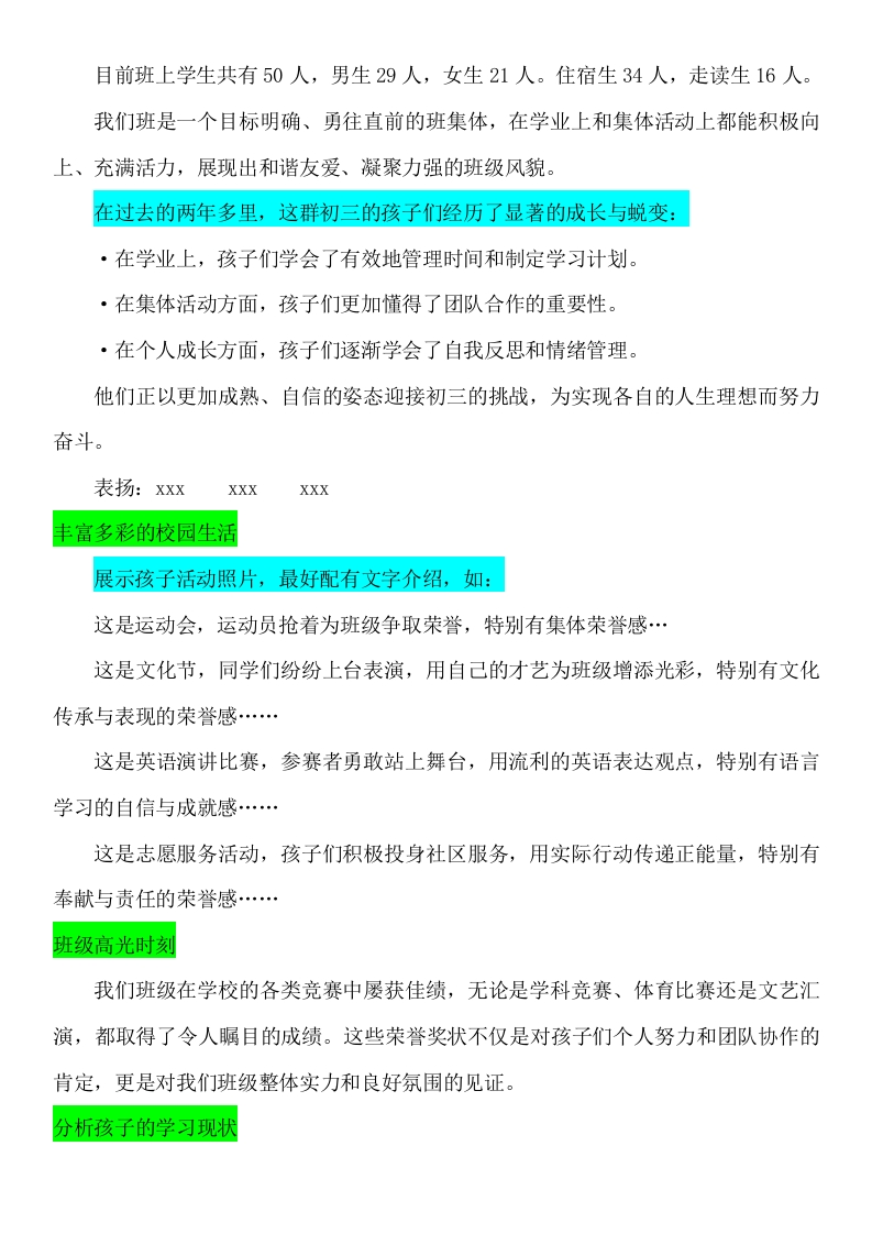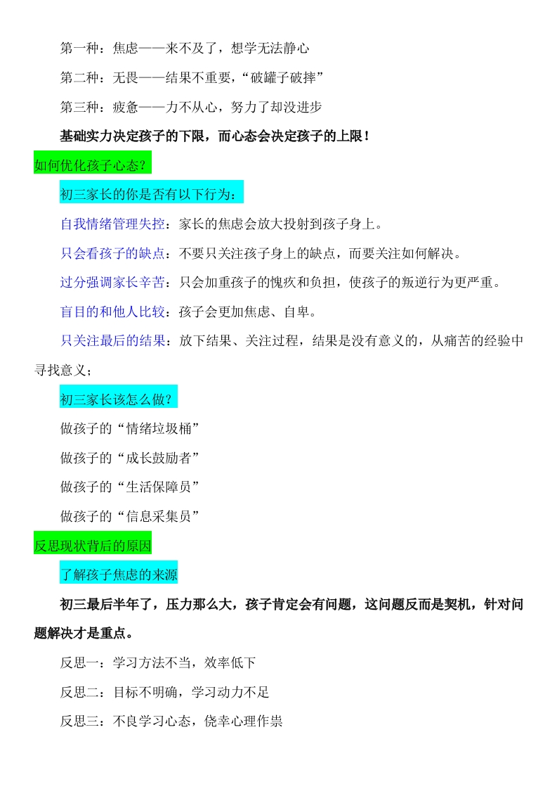 【初三】【秋季上】期末家长会:初三备战没有不辛苦的晨晨老师2个月前发布关注私信43.48KB25页02314 以下为资料部分截图预览,下载后为超高清原文件。 第1页 / 共25页 第2页 / 共25页 第3页 / 共25页 试读已结束,还剩22页,您可下载完整版后进行离线阅读 加入VIP,享海量教务资料,无限制免费下载所有材料 【初三】【秋季上】期末家长会:初三备战没有不辛苦的此内容为付费资源,请付费后查看¥9.9¥15.9VIP会员免费代理(享70%分佣)免费立即购买您当前未登录!建议登陆后购买,可保存购买订单付费资源© 版权声明文章版权归作者所有,未经允许请勿转载。THE END综合资料 文本预览 【初三上】【初三备战没有不辛苦的】期末家长会-发言稿尊敬的各位家长:大家好!首先,衷心感谢您在百忙之中抽出宝贵时间参加本次初三上学期的期末家长会《初三备战没有不辛苦的》。“学校、家长、学生”是命运共同体!40%学生的努力+30%教师的助力+30%家长的推动=中考成功!在这个关键节点,孩子们正站在人生的一个小小十字路口,面临着学业压力与成长挑战的双重考验,而此次家长会,恰似一场及时雨,为我们共同探究孩子现状、明确未来方向搭建了至关重要的沟通桥梁。初三,是初中生活的攻坚阶段,知识的深度与广度大幅提升,学习节奏日益加快。这学期,孩子们一路“过关斩将”,在各个学科领域都付出了诸多努力,通过期末考试,犹如一次全方位的“学业体检”,清晰呈现出他们目前的知识掌握程度、学习方法的成效以及应试状态,这是我们探究孩子学习现状最直观、关键的依据。同时,初三又不仅仅是知识的积累,更是心理成长、品格塑造的重要时期。孩子们在面对升学压力时,有的可能愈发坚韧自信,勇往直前;有的或许偶尔迷茫焦虑,脚步踌躇。他们的情绪变化、社交互动、自我认知,如同隐藏在成绩背后的密码,亟待我们一起去解读,全方位了解孩子当下的身心状态,才能给予最贴心有效的支持。希望在接下来的交流中,我们都能敞开心扉,深度沟通,为孩子们初三下学期的乘风破浪、扬帆远航,谋好篇、布好局!本次家长会内容分4部分进行:1探究·孩子学习现状;2正确•认识中考3共识•初三学习方向;4共育·引领孩子前行;5超越科学规划寒假。一、探究孩子学习现状走进我们班 查看更多 收起部分 喜欢就支持一下吧点赞14 分享QQ空间微博QQ好友海报分享复制链接收藏