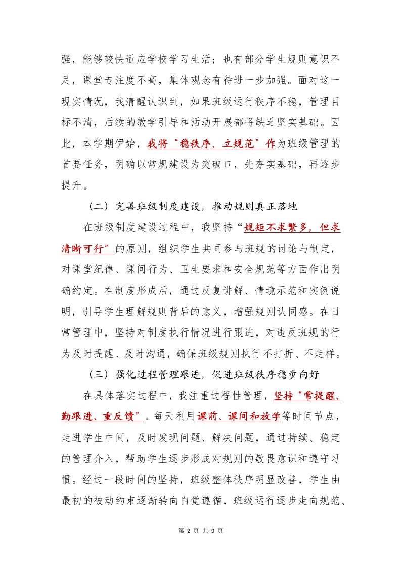 2025-2026学年第一学期班主任工作总结——握一束微光耕耘,护一方宁静热土晨晨老师29天前发布关注私信0.37MB9页0577 以下为资料部分截图预览,下载后为超高清原文件。 第1页 / 共9页 第2页 / 共9页 试读已结束,还剩7页,您可下载完整版后进行离线阅读 加入VIP,享海量教务资料,无限制免费下载所有材料 2025-2026学年第一学期班主任工作总结——握一束微光耕耘,护一方宁静热土此内容为付费资源,请付费后查看¥9.9¥15.9VIP会员免费代理(享70%分佣)免费立即购买您当前未登录!建议登陆后购买,可保存购买订单付费资源© 版权声明文章版权归作者所有,未经允许请勿转载。THE END综合资料 文本预览 2025-2026学年第一学期班主任工作总结—握一束微光耕耘,护一方宁静热土正如电影《疯狂动物城》中所说:“在动物城,每一个生命,都有无限可能。”小学阶段,正是学生性格逐渐定型、行为习惯逐步养成的重要时期。作为班主任,我深知这一阶段的教育工作,既不能急于求成,也不能放任自流,而是要在日复一日的陪伴、提醒与引导中,为学生的成长奠定稳定而坚实的基础。2025年秋季学期,我继续担任小学班主任工作。面对学生个体差异明显、行为习惯基础参差不齐、家校期待多元的现实情况,我始终坚持以立德树人为根本任务,以学生健康成长为出发点和落脚点,围绕“稳秩序、抓习惯、强管理、重关爱、促协同”的工作思路,扎实推进班级各项管理与育人工作。现将本学期班主任工作总结如下。一、以“稳”为基,夯实班级运行的基本盘(一)立足班情实际,科学研判管理重点学期初,我对班级整体情况进行了较为系统的分析。从学生的学习基础、行为习惯到家庭支持情况进行全面了解后发现,班级学生个体差异较为明显:一部分学生自律意识较第1页共9页 查看更多 收起部分 喜欢就支持一下吧点赞7 分享QQ空间微博QQ好友海报分享复制链接收藏