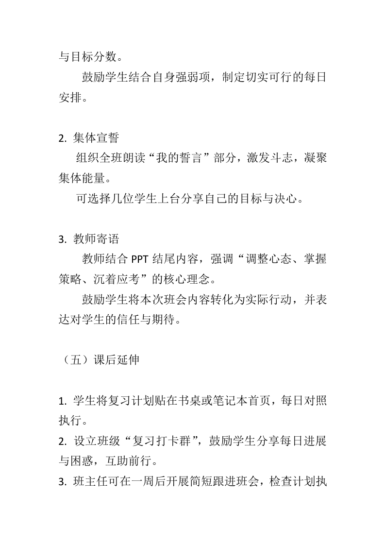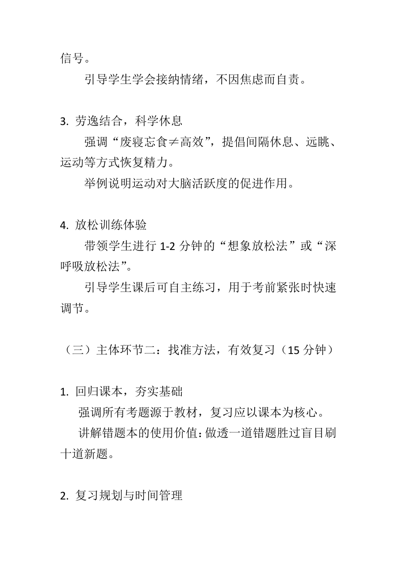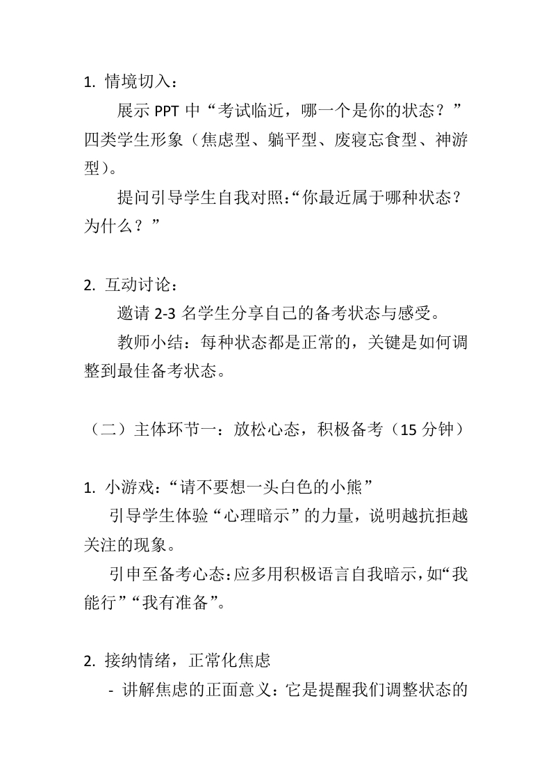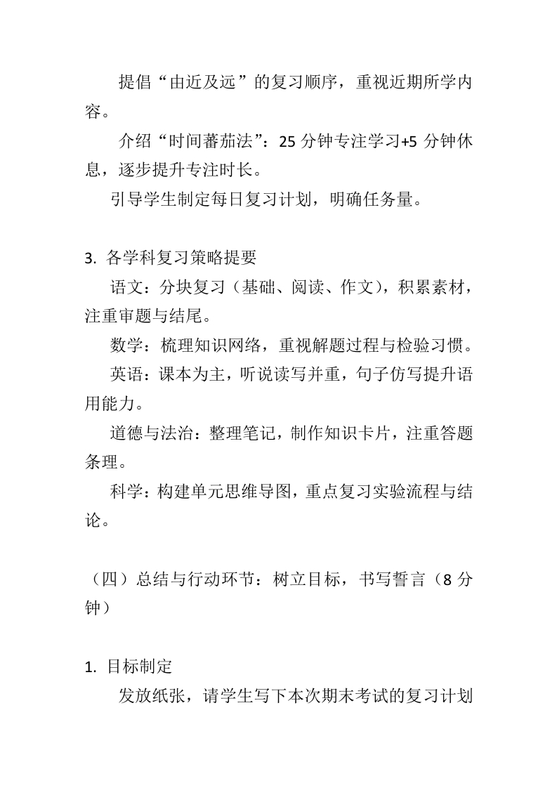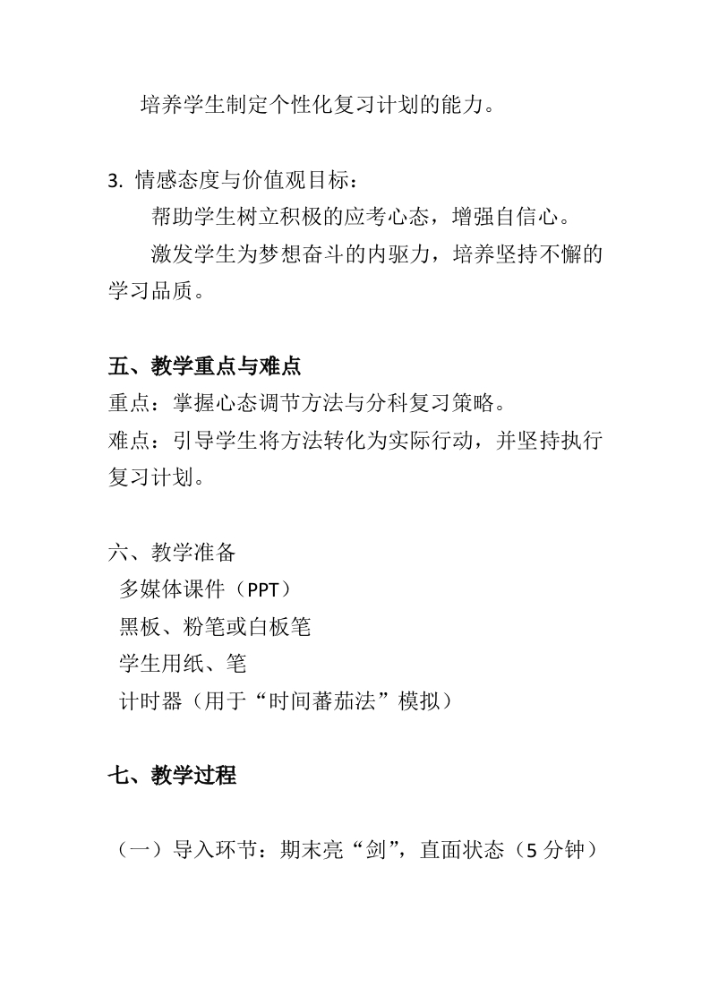 【通用】【期末考前动员】主题班会:期末亮剑,赢在眼前-教案晨晨老师29天前发布关注私信15.07KB8页05314 以下为资料部分截图预览,下载后为超高清原文件。 第1页 / 共8页 第2页 / 共8页 第3页 / 共8页 第4页 / 共8页 第5页 / 共8页 第6页 / 共8页 第7页 / 共8页 第8页 / 共8页 已完成全部阅读,共8页 加入VIP,享海量教务资料,无限制免费下载所有材料 【通用】【期末考前动员】主题班会:期末亮剑,赢在眼前-教案此内容为付费资源,请付费后查看¥9.9¥15.9VIP会员免费代理(享70%分佣)免费立即购买您当前未登录!建议登陆后购买,可保存购买订单付费资源© 版权声明文章版权归作者所有,未经允许请勿转载。THE END综合资料 文本预览 “期末亮剑,赢在眼前”主题班会教案一、教学主题期末亮剑,赢在眼前一一心态调整与高效复习策略指导二、教学对象小学高年级/初中/高中学生三、教学时间45分钟四、教学目标1.知识与技能目标:·学生能说出至少三种缓解考试焦虑的方法。·-学生能掌握各学科复习的基本策略与时间管理方法。2.过程与方法目标:通过情境讨论、游戏互动、小组分享等形式,引导学生认识自身备考状态。 查看更多 收起部分 喜欢就支持一下吧点赞14 分享QQ空间微博QQ好友海报分享复制链接收藏