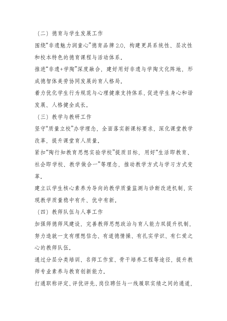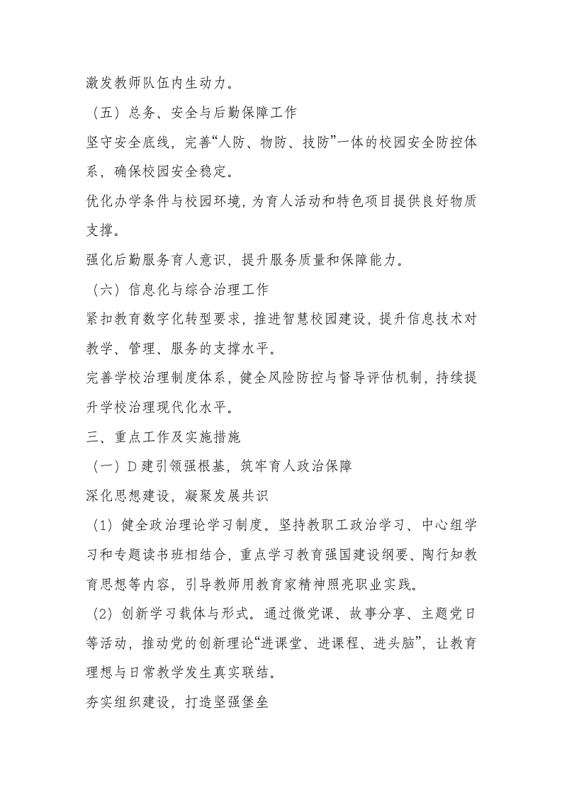 学校2026年工作计划晨晨老师28天前发布关注私信17.22KB8页04213 以下为资料部分截图预览,下载后为超高清原文件。 第1页 / 共8页 第2页 / 共8页 第3页 / 共8页 试读已结束,还剩5页,您可下载完整版后进行离线阅读 加入VIP,享海量教务资料,无限制免费下载所有材料 学校2026年工作计划此内容为付费资源,请付费后查看¥9.9¥15.9VIP会员免费代理(享70%分佣)免费立即购买您当前未登录!建议登陆后购买,可保存购买订单付费资源© 版权声明文章版权归作者所有,未经允许请勿转载。THE END计划汇报 文本预览 一、指导思想以教育强国战略为总牵引,全面贯彻d的教育方针,全面落实立德树人根本任务,牢牢把握“为党育人、为国育才”的时代使命。坚持用…思想统领学校一切工作,把“D建+五育融合”作为引领学校高质量发展的主抓手,把“非物质文化遗产传承教育示范学校”创建和“陶行知教育思想实验学校”提质建设作为学校内涵发展的主赛道,把“非遗魅力润童心”德育品牌2.0版打造作为学校特色彰显的主支点。坚持“守正与创新并重、质量与特色并举、提升与赋能同步”的工作思路:在守牢政治方向和安全底线的前提下,传承学校已有的办学传统和品牌成果,主动对接教育新政策、回应社会新期待、适应学生新需求,推动课程教学、育人方式、学校治理等方面系统性重构与持续性优化,努力形成目标同向、路径同频、落实同力的良好局面,为教育强国建设贡献学校力量。二、各部门工作目标(一)D建与党务工作以思想政治建设为统领,持续强化理论武装和理想信念教育,提升全体教职员工政治判断力、政治领悟力、政治执行力。深化“D建+五育融合”品牌建设,推动D建与德育、课程、文化、管理深度融合,把支部建在业务链上,把党旗插在项目上。夯实基层组织建设,创建学习型、服务型、创新型党支部,全面提高D组织战斗堡垒作用。 查看更多 收起部分 喜欢就支持一下吧点赞13 分享QQ空间微博QQ好友海报分享复制链接收藏