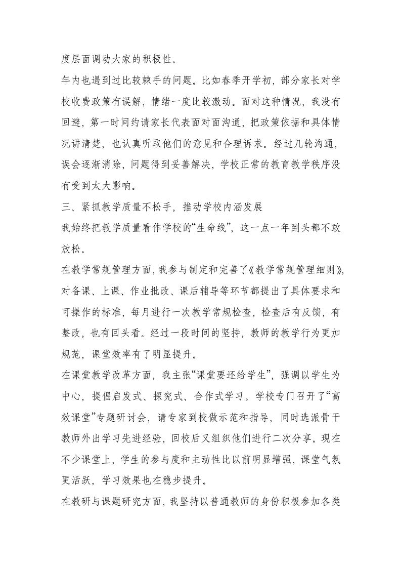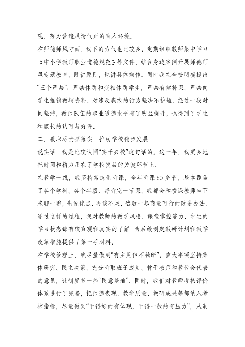 2025校长个人述职报告:踏踏实实,真抓实干,不断提高学校的办学水平!晨晨老师28天前发布关注私信17.27KB7页0368 以下为资料部分截图预览,下载后为超高清原文件。 第1页 / 共7页 第2页 / 共7页 第3页 / 共7页 试读已结束,还剩4页,您可下载完整版后进行离线阅读 加入VIP,享海量教务资料,无限制免费下载所有材料 2025校长个人述职报告:踏踏实实,真抓实干,不断提高学校的办学水平!此内容为付费资源,请付费后查看¥9.9¥15.9VIP会员免费代理(享70%分佣)免费立即购买您当前未登录!建议登陆后购买,可保存购买订单付费资源© 版权声明文章版权归作者所有,未经允许请勿转载。THE END综合资料 文本预览 各位领导、各位老师:一晃又是一年。回头看,这一年基本是在忙碌中度过的:有压力,也有收获。总体来说,在上级教育部门的领导下,在全体教职工的支持配合下,我尽力坚守教育初心,认真履职,较好完成了年初确定的各项工作目标。下面,把这一年的工作情况向大家做个汇报,也算是对自己这段时间的一次梳理。一、坚持学习不放松,努力提升思想境界我始终觉得,思想观念是行动的“总开关”,学校领导如果脑子里不“装点东西”,工作就容易走偏。这一年,我还是把理论学习、政策学习摆在比较靠前的位置,系统学习了国家教育方针、上级教育部门的文件精神和有关教育理论,结合学校实际反复思考、对照梳理,自己的教育理念和责任意识都有了进一步强化。在学习方式上,我坚持每周组织班子成员集中学习,大家一起读文件、谈认识。我本人也坚持带头写学习心得,不是为了“完成任务”,而是逼着自己静下心来想一想:这些理念怎么落到学校管理、课堂教学和教师发展上。在日常工作中,我给自己定了“三个带头”:带头遵守学校的规章制度;带头践行师德师风要求;带头维护学校的整体形象。很多事情我尽量做到先自己照着做,再去要求老师,通过一点一滴的言传身教,引导教师树立更为科学的教育观、学生观和质量 查看更多 收起部分 喜欢就支持一下吧点赞8 分享QQ空间微博QQ好友海报分享复制链接收藏