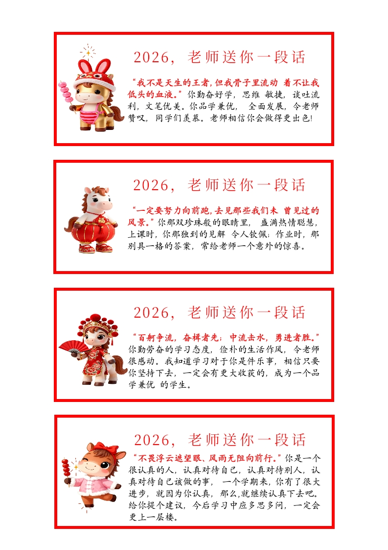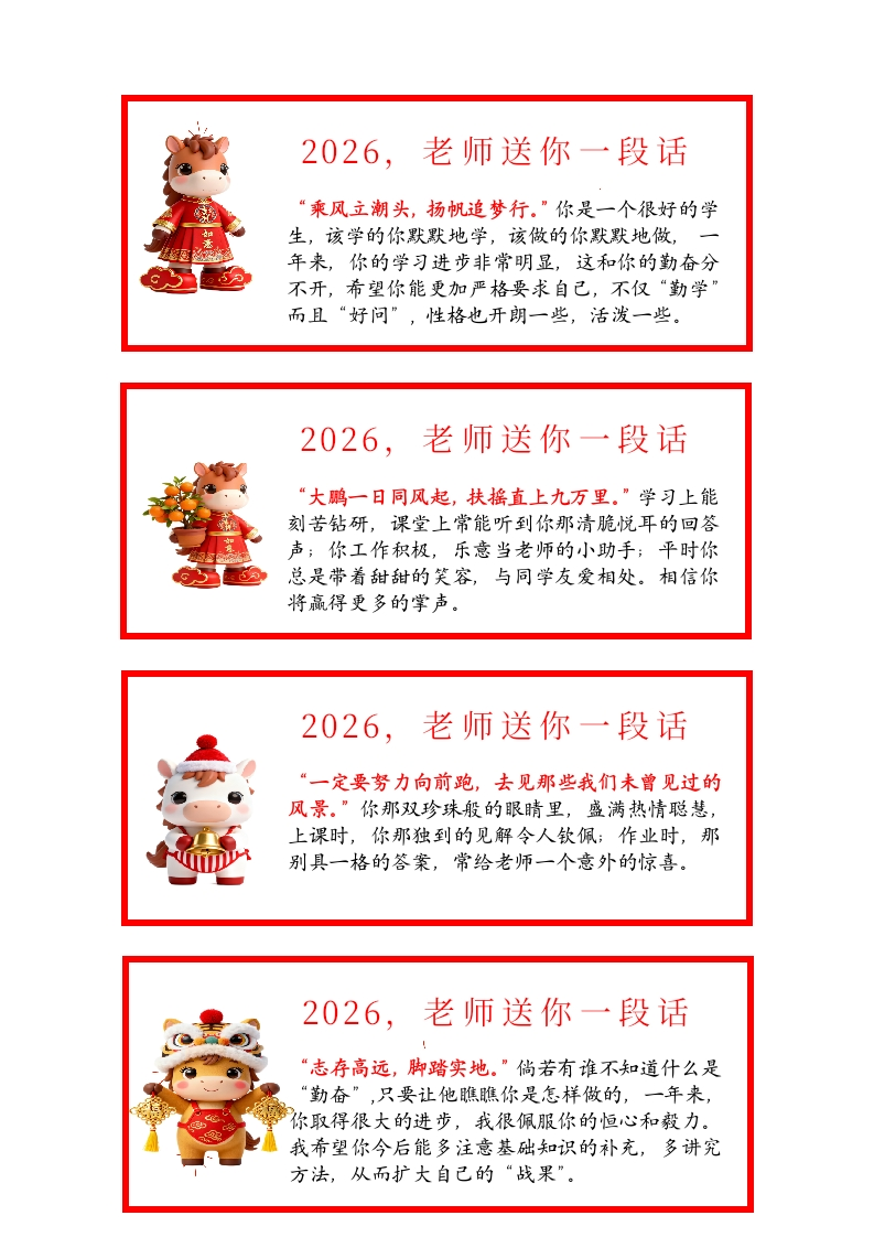 送给表现一直优秀的同学2026,老师送你一段话“当你在追光,你与光同航。”你是一个聪明有个性的孩子,每天努力学习,力求超越自己。你的认真,你的执着为你开创出一条通往成功的道路。愿你在新的一年中更加努力,取得更加骄人的成绩。2026,老师送你一段话“当一个人踮起脚尖靠近太阳的时候,全世界都挡不住他的阳光。”你踏踏实实,一丝不苟,勤奋刻苦,学习成绩上总会有一鸣惊人之举。愿你在以后的学习中像太阳一般激情似火,光芒万丈!2026,老师送你一段话“书者文必工,艺者技必良;有恒者不声张,功成时美名扬。”你是个很上进的孩子,学习上勤奋刻苦,毫不懈怠。你用汗水浇灌出成功之花,用努力铺就通往未来的道路。2026,老师送你一段话“你的未来藏在你现在的努力里。”你是个认真负责的课代表,每天做好自己的本职工作,上课认真听讲,做好笔记,那专心致志的神情令老师感动。愿你在新学期中快乐地学习,取得更好的成绩。