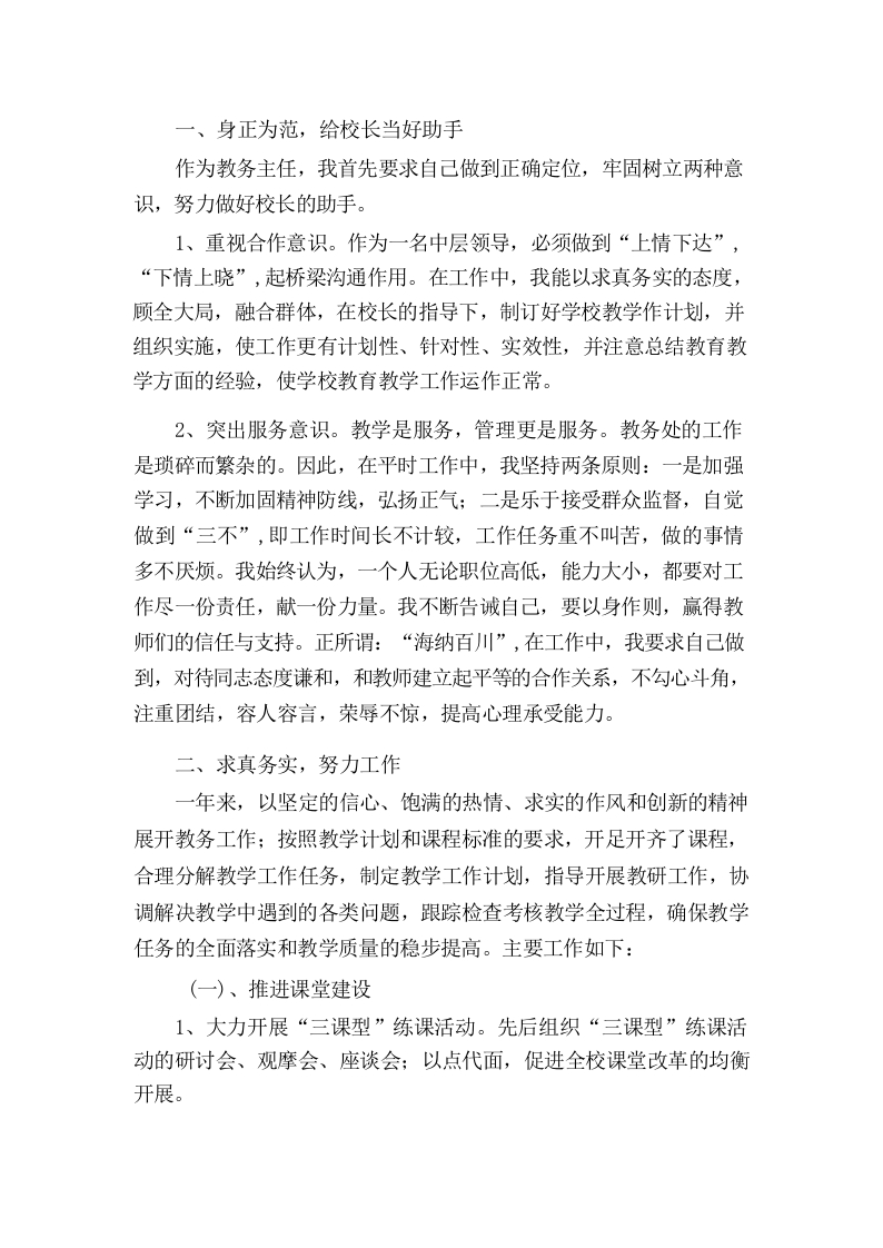 学校教务处主任述职报告晨晨老师25天前发布关注私信19.42KB5页04012 以下为资料部分截图预览,下载后为超高清原文件。 第1页 / 共5页 第2页 / 共5页 试读已结束,还剩3页,您可下载完整版后进行离线阅读 加入VIP,享海量教务资料,无限制免费下载所有材料 学校教务处主任述职报告此内容为付费资源,请付费后查看¥9.9¥15.9VIP会员免费代理(享70%分佣)免费立即购买您当前未登录!建议登陆后购买,可保存购买订单付费资源© 版权声明文章版权归作者所有,未经允许请勿转载。THE END综合资料 文本预览 教务处主任述职报告受学校领导委托,协助汤校长负责教务处工作,一年来,教务处工作一直处于紧张和忙碌之中,在学校领导的关心指导下,在其它处室配合下,在教研组长、任课老师的支持下,团结协作、认真工作,保证了学校教学工作的正常展开,如果说教务处对学校工作有点贡献的话,这是我们集体劳动的结果。教务处是负责学校教学和教学行政管理工作的职能机构,通过本年在教务处的工作经历和体会中,感觉到教务处有如下特点:1.责任重大:教务处肩负着学校教育目标和专业教学计划实施的重任,平时还要接受来自教育局和其他单位布置的临时的和阶段性的工作,只有慎密地组织、切实地安排才能保证教学活动正常开展。2.事务繁杂:教务处的工作包括教学工作计划的制订实施、合理科学地安排和使用教师,日常教学的管理,教师工作量的统计和调整,教育教学情况的检查,调课安排,教研活动安排,各种考试的组织,课程设置的研讨,运动会的安排,技术比武训练活动的组织检查,审核学生休学、转学、毕业,协助校长安排教师的业务进修和岗位培训。这些工作无不包含着巨大的劳动。3.矛盾众多:有来自于教学计划与社会需求的矛盾。来自于上级临时工作与学校常规工作的矛盾,教师在教育教学和实习工作中遇到急待解决困难的矛盾,对教师教学情况检查,考核和管理的矛盾等。这些矛盾贯穿着整个学年,种种棘手的矛盾均需在日常工作中予以解决。4.批评集中:由于工作繁多,难以周全,加上生源素质差的影响,学风和教风均有待提高,招致“管理难,难管理”等方面的批评。总之,本部门的工作重要、繁杂,且处在风口浪尖上。回顾一年来的工作,有喜悦,也有困惑:现就本年度的工作述职如下,恳请领导和同事们给予指导: 查看更多 收起部分 喜欢就支持一下吧点赞12 分享QQ空间微博QQ好友海报分享复制链接收藏
