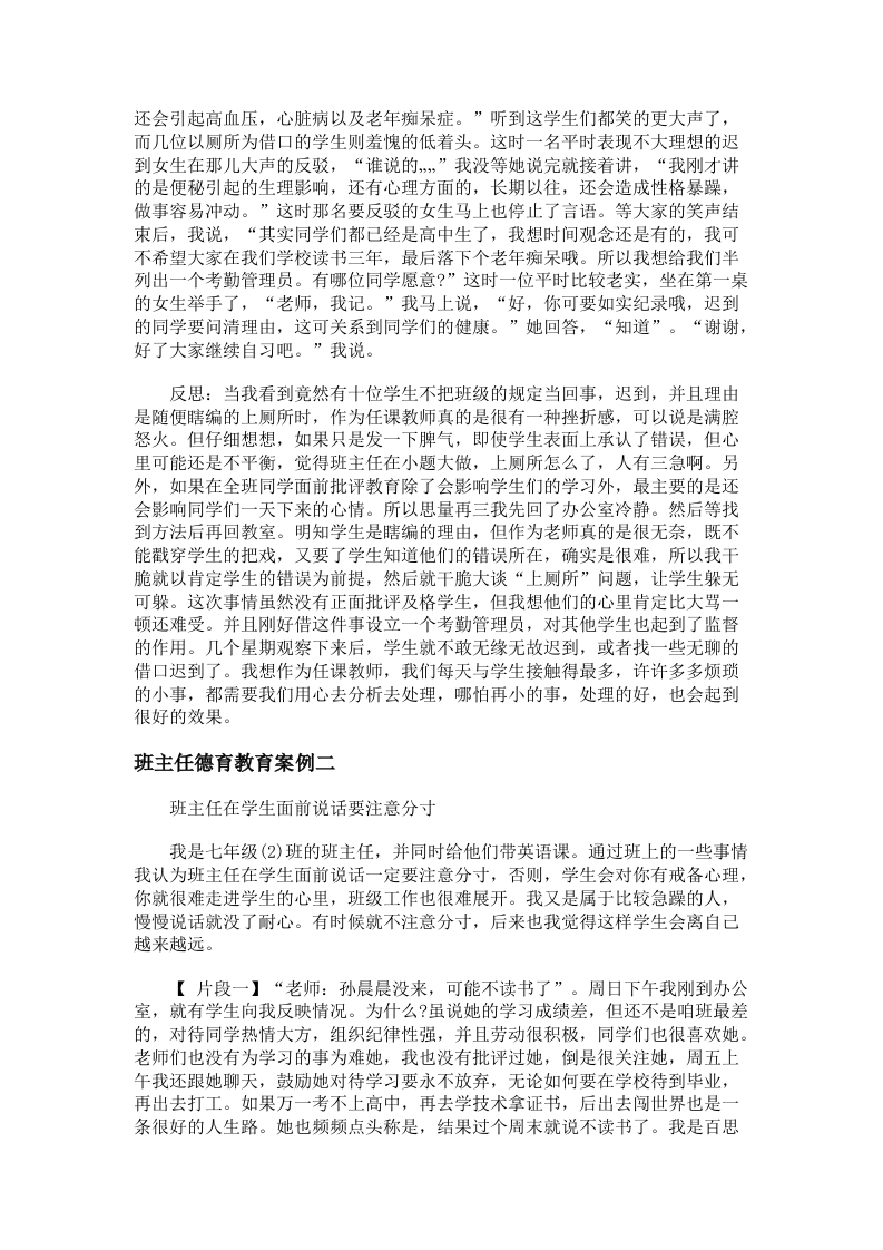 班主任德育教育案例随着素质教育观念逐渐深入人心,德育工作在高中受到了越来越多的重视。尤其是在班主任工作中,做好德育工作,对于提高班级管理工作的效率,促进学生的良好发展有着重要的帮助作用。下面是小编为大家整理的班主任德育教育案例,供大家分享班主任德育教育案例一一一迟到的原因背景:随着教学改革的推进,老师们也在感叹学生的素质也是一年不如一年。学生们都有很强的个性,我们要去改变他们一些长期形成的坏习惯,还真不容易,这不仅仅要求我们要关心学生,更要求我们要用科学的方法,用心去分析去处理,用足够的机智去帮助他们成长。为了从一开始就让学生抓紧学业,我规定我任课班学生每节要准时到教室。但一段时间下来迟到者屡禁不止较多,于是我决定在适当时间对学生进行有效的考勤教育。案例:一个星期上课前我准点到教室时,还有10位学生未到,于是一种莫名的怒火在我心中产生,我脸上也流露出了不悦的表情,教室里很安静,但我也能感觉到有很多学生感觉到了我的不悦,在偷偷的用眼睛打量着我这位班主任,似乎在等着我的大发雷霆。我马上决定就站在门口等那这十位迟到者。先来了两位女生,给出的理由是忘记了时间。又来了两位男生,他们给我的理由有是去厕所了。一直到上课十多分过去了,这10位学生才到齐,其中有四位男生,六位女生。男生给出的理由是全部是上厕所,女生有四位给出了上厕所的理由,而两位说是忘记时间了。作为任课教师对于他们编出的所谓厕所的理由肯定是不接受的,我强压着胸中的这团怒火,听完他们的解释后就叫他们进去看书了,我又进了教室转了一圈,然后就去办公室,因为我知道我需要冷静,发脾气根本改变不了什么。回到办公室冷静下后,我马上上网搜索了便秘的危害,列了一张清单。半个小时后,我整理了一下心情,又重新走进了教室。转了一圈后,我说:“同学们请停一下,我说几句,相信大家也看到了,我们刚才一共有10位同学迟到,其中两位同学给出的理由是忘记了时间,我觉的记忆力不好,这个可以原谅,只要加强记忆就可以了,所以请这两位同学于晚自习结束前把学校的作息时间表默写给我。我奇怪的是另外8位同学(四位男生,四位女生)都说在厕所,如果我没有记错的话女厕所有6个坑,我们班占了4个,男厕所我不知道有几个坑,但我们也占了4个”有同学回答,“老师,5个。”我接着说,“哦,五个,不错,从占有率上说,男生还比女生略胜一筹,我觉得很欣慰,希望同学再接再厉,以后在学校的各项比赛中也多占名额。”这时,全班同学都笑了,那几个以厕所为迟到理由的同学也难为情的笑了。看到了大家的高兴劲,我接着说,“可是作为班主任我也很担心,担心部分同学的身体,为什么呢?同学们想想,最晚的几位同学竟然迟到了9分钟啊,呆在厕所9分钟肯定是便秘。便秘可不是一件小事,刚才我特地去网上查了一下。便秘能引起口臭,屁臭,长此以往