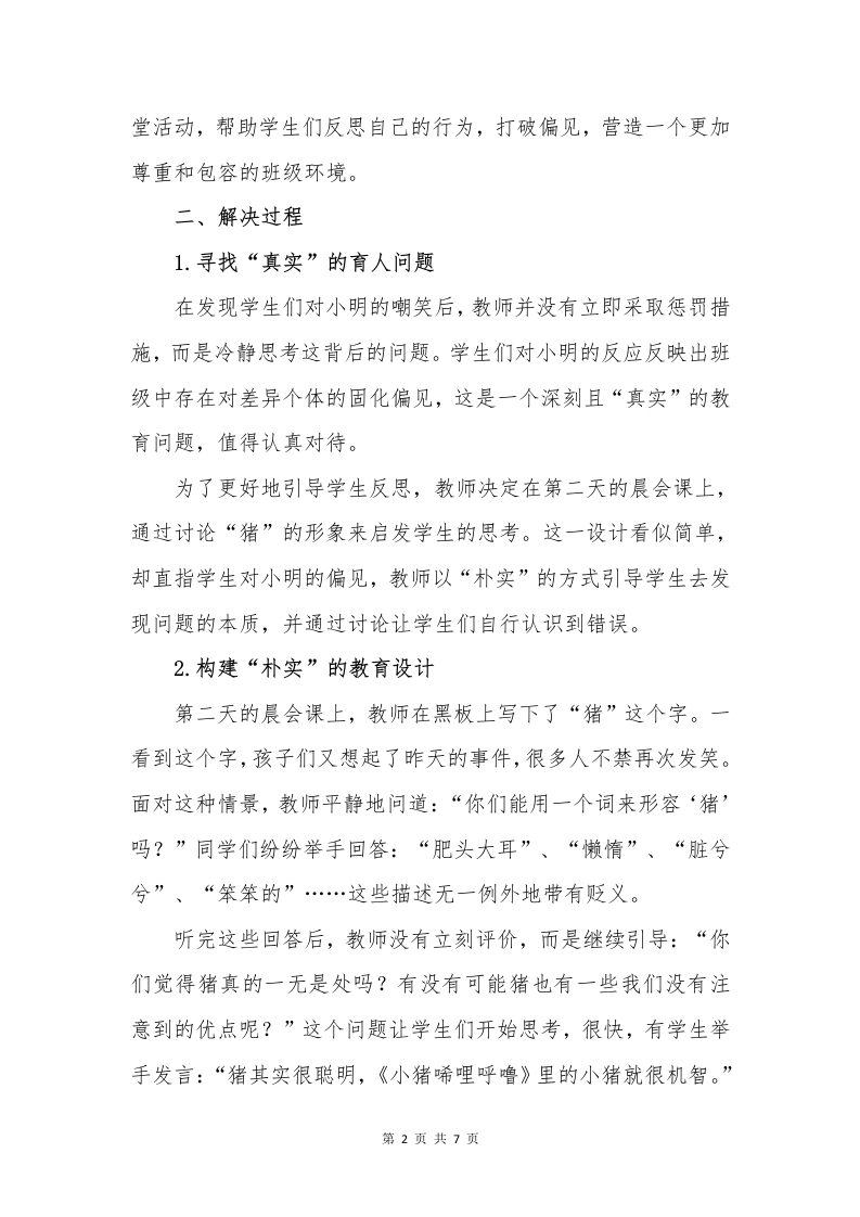 班主任德育案例晨晨老师25天前发布关注私信0.24MB7页04910 以下为资料部分截图预览,下载后为超高清原文件。 第1页 / 共7页 第2页 / 共7页 试读已结束,还剩5页,您可下载完整版后进行离线阅读 加入VIP,享海量教务资料,无限制免费下载所有材料 班主任德育案例此内容为付费资源,请付费后查看¥9.9¥15.9VIP会员免费代理(享70%分佣)免费立即购买您当前未登录!建议登陆后购买,可保存购买订单付费资源© 版权声明文章版权归作者所有,未经允许请勿转载。THE END综合资料 文本预览 撕掉“标签”践行三实,打破“偏见”塑造初心班主任德育案例分析摘要:德育是教育的核心与灵魂,关系到学生的全面发展与健康成长。作为班主任,既要关注学生的学业成绩,更要重视他们的道德品质和心理健康。在实际的德育工作中,基于“三实”德育理念,教师需要通过“真实”地发现育人问题,“朴实”地构建教育设计,并“扎实”地实施有效的对策,确保德育目标的全面落实。本文通过一个班主任处理学生间偏见与标签化现象的具体案例,深入探讨如何在教育实践中践行“三实”德育理念。关键词:班主任;德育案例;三实德育理念;偏见;尊重:教育智慧一、案例概述小明(化名)是班级中一个性格温和但在学习上表现较为缓慢的孩子。他的外表圆润,行为显得迟钝,这使得他在班级里时常成为一些同学的嘲笑对象。一次课堂上,教师要求学生写一个比喻句,小明写下了“我像一头肥肥的猪,在草原上跑得很慢”,这一句子引发了全班同学的哄堂大笑,尤其是几个调皮的学生更是抓住这个机会对他进行嘲讽。教师敏锐地意识到这不仅仅是一次玩笑,而是反映了学生们对小明存在的深刻偏见与标签化问题。这是一个不可忽视的“真实”育人问题,如果不加以正确引导,可能会对小明的心理健康和班级的氛围造成不良影响。因此,教师决定通过一次特别的课第1页共7页 查看更多 收起部分 喜欢就支持一下吧点赞10 分享QQ空间微博QQ好友海报分享复制链接收藏