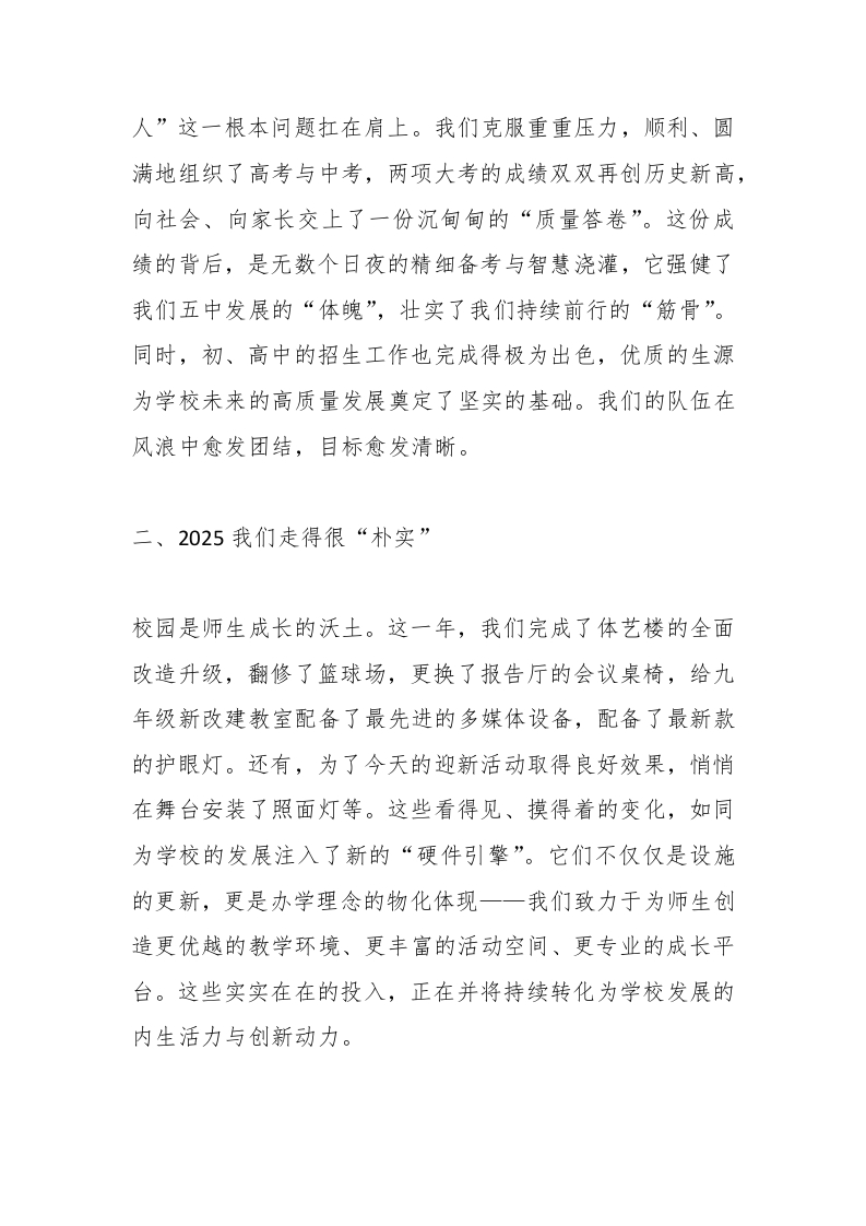 某中学校长在2026年迎新活动上的致辞晨晨老师24天前发布关注私信14.61KB5页03111 以下为资料部分截图预览,下载后为超高清原文件。 第1页 / 共5页 第2页 / 共5页 试读已结束,还剩3页,您可下载完整版后进行离线阅读 加入VIP,享海量教务资料,无限制免费下载所有材料 某中学校长在2026年迎新活动上的致辞此内容为付费资源,请付费后查看¥9.9¥15.9VIP会员免费代理(享70%分佣)免费立即购买您当前未登录!建议登陆后购买,可保存购买订单付费资源© 版权声明文章版权归作者所有,未经允许请勿转载。THE END校长讲话 文本预览 某中学校长在2026年迎新活动上的致辞尊敬的每一位五中人,亲爱的老师们、家人们:大家下午好!时序轮转、新元肇启。在这辞旧迎新、共话未来的美好时刻,我们全校教职工欢聚一堂,共同回望我们一起走过的2025年,携手展望充满希望的2026年。首先,我代表学校领导班子,向一年来为学校发展辛勤耕耘、无私奉献的全体教职员工及你们的家人,致以最诚挚的感谢和最美好的新年祝福!2026新年快乐!过去的一年,是学校发展历程中极不平凡、极不寻常的一年。我们经历了一些磨难和波折,但此刻在我脑海里呈现更多的是老师们在日常教学中的稳扎稳打,在多个关键领域实现的突破性进展,一个个感人的瞬间定格在这不平凡的一年,令人感慨、难以忘怀。此刻,让我们一起盘点2025五中人坚实而有力的前行足迹。一、2025我们走得很“求实”这一年,我们始终将“培养什么人、怎样培养人、为谁培养 查看更多 收起部分 喜欢就支持一下吧点赞11 分享QQ空间微博QQ好友海报分享复制链接收藏