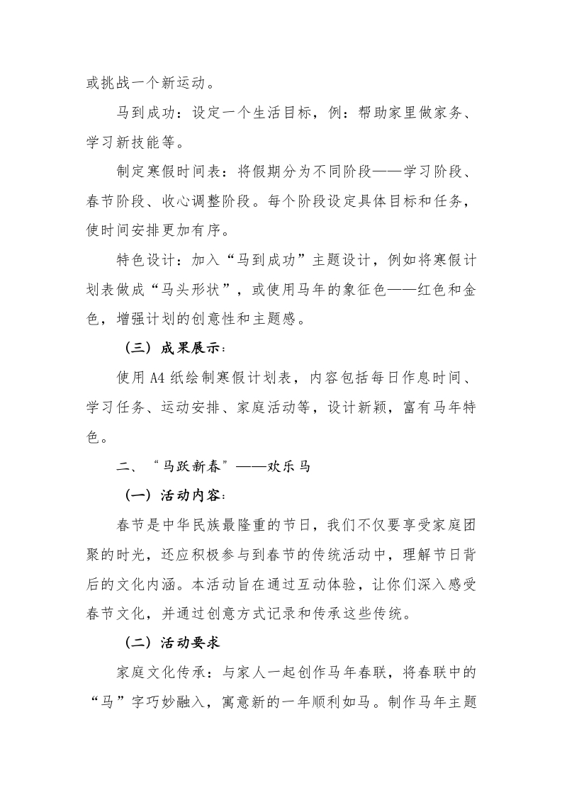 2026年马年德育实践作业——马驰骉骉志气昂,前程朤朤步步升晨晨老师22天前发布关注私信0.28MB11页0267 以下为资料部分截图预览,下载后为超高清原文件。 第1页 / 共11页 第2页 / 共11页 试读已结束,还剩9页,您可下载完整版后进行离线阅读 加入VIP,享海量教务资料,无限制免费下载所有材料 2026年马年德育实践作业——马驰骉骉志气昂,前程朤朤步步升此内容为付费资源,请付费后查看¥9.9¥15.9VIP会员免费代理(享70%分佣)免费立即购买您当前未登录!建议登陆后购买,可保存购买订单付费资源© 版权声明文章版权归作者所有,未经允许请勿转载。THE END综合资料 文本预览 2026年马年德育实践作业马驰骉骉志气昂,前程朋朋步步升骏马踏春至,少年奋蹄时!随着2026年马年的到来,我们迎来了充满活力与希望的寒假。马,象征着奔腾不息、勇往直前的精神,正如你们在成长的道路上,正蓄势待发,准备在新的一年里追逐梦想、勇敢前行。为了让大家能够在假期中获得更多的成长,学校精心设计了以“骏马”为主题的寒假德育实践作业。这些活动不仅有助于你们更好地规划假期,体验春节文化、提升品德素养、参与运动锻炼,还鼓励大家勇敢追梦,勇往直前,像马一样,奔腾在各自的道路上,收获不一样的成长与体验。一、“骏马驰骋”一一规划马(一)活动内容寒假是一个短暂的休息时光,但如果没有合理的规划,它很容易变得拖沓和懒散。为了让寒假既充实又有意义,合理规划是关键。你将通过“马年主题规划法”制定一个详细的寒假计划,确保在轻松的氛围中也能提高效率,度过一个充实有意义的假期。(二)活动要求勇往直前:设定一个学习目标,例:阅读一本书、完成一项线上课程等。马不停蹄:设定一个运动目标,例:每天运动30分钟 查看更多 收起部分 喜欢就支持一下吧点赞7 分享QQ空间微博QQ好友海报分享复制链接收藏