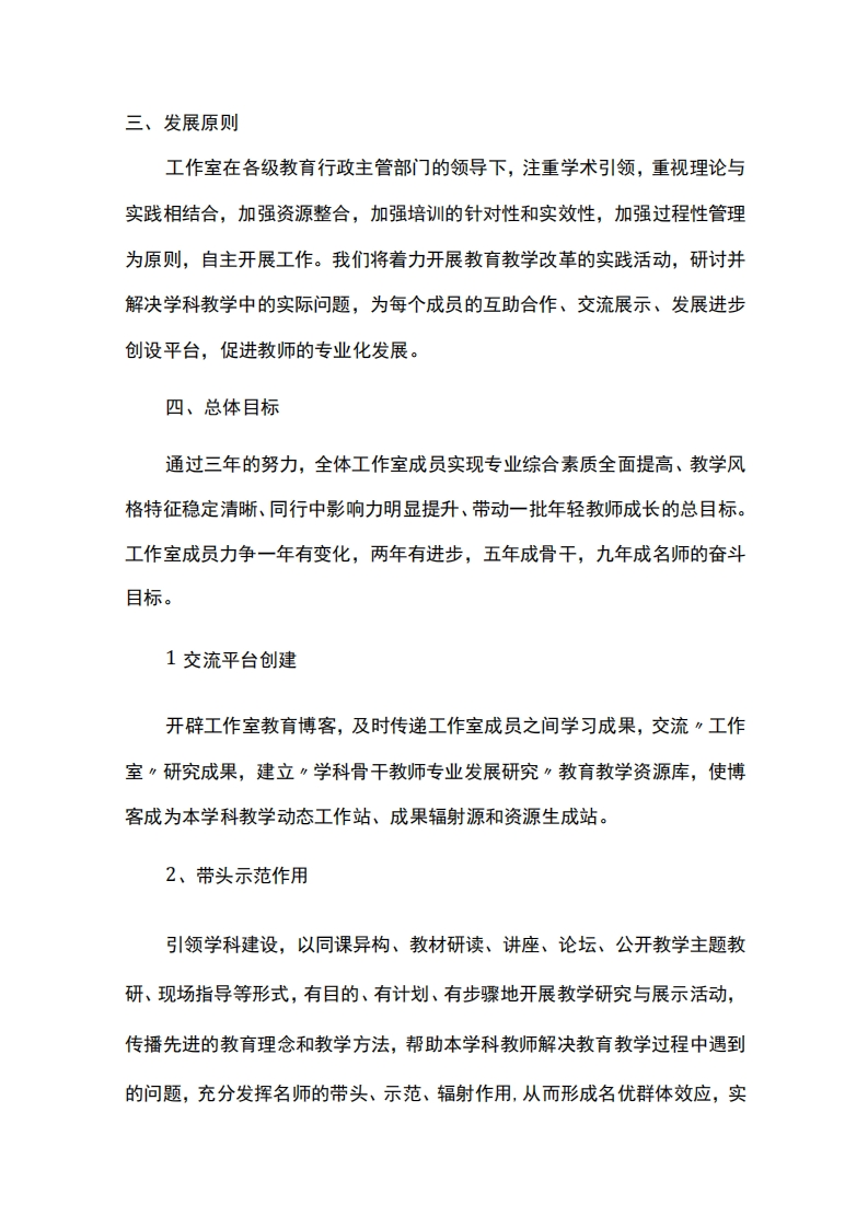 中小学名师工作室三年发展规划晨晨老师19天前发布关注私信0.18MB5页0375 以下为资料部分截图预览,下载后为超高清原文件。 第1页 / 共5页 第2页 / 共5页 试读已结束,还剩3页,您可下载完整版后进行离线阅读 加入VIP,享海量教务资料,无限制免费下载所有材料 中小学名师工作室三年发展规划此内容为付费资源,请付费后查看¥9.9¥15.9VIP会员免费代理(享70%分佣)免费立即购买您当前未登录!建议登陆后购买,可保存购买订单付费资源© 版权声明文章版权归作者所有,未经允许请勿转载。THE END综合资料 文本预览 中小学名师工作室三年发展规划为充分发挥名师的专业引领、带动、辐射作用,使之成为教学资源的集散地,努力搭设课堂教学与研究的操练场,创建教师专业发展和成长的给养所,让全体成员在与团队的合作中,博取众家精华,形成各自的教学风格与独特的教育思想,加速教师专业化发展,培养造就更多的优秀教师提高教书育人水平,特制定工作室三年发展规划。一、指导思想按照《中小学德育工作指南》《关于进一步加强中小学班主任工作的意见》、《中小学教师工作规定》等文件的要求,以提高教师管理水平,促进教师专业化成长,更好地担负立德树人的总任务为目标,发挥指导、示范、引领、辐射作用,扩大工作室的知名度,带动并培养一批〃师德高尚、学识渊博、业务精湛〃的高层次骨干教师,实现优质教育资源共享,促进教育的均衡发展,全面提高教育质量,努力办人民满意的教育。二、发展理念以提高骨干教师培训质量和效益为核心,以教育教学实践为主渠道,围绕本工作室教师队伍建设目标,求真务实,开拓创新,为提升教师专业水平搭建教科研平台,提供专业成长和发展的空间,切实做好教师培养工作,充分发挥工作室的示范、引领、辐射和带动作用,促进中青年教师健康、可持续地成长,成为高中学科有影响力的骨干教师、学科带头人和名教师的后备梯队。 查看更多 收起部分 喜欢就支持一下吧点赞5 分享QQ空间微博QQ好友海报分享复制链接收藏