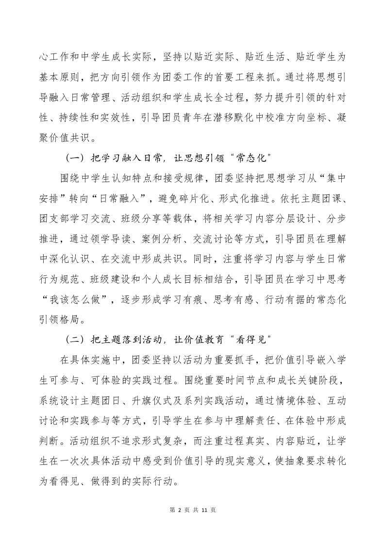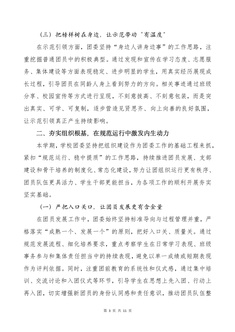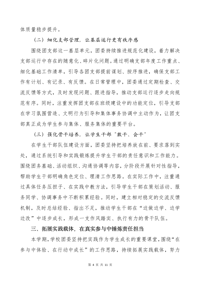 2025-2026第一学期团委书记工作总结(不是往前站,而是往下扎)讲稿晨晨老师19天前发布关注私信0.38MB11页03510 以下为资料部分截图预览,下载后为超高清原文件。 第1页 / 共11页 第2页 / 共11页 第3页 / 共11页 第4页 / 共11页 试读已结束,还剩7页,您可下载完整版后进行离线阅读 加入VIP,享海量教务资料,无限制免费下载所有材料 2025-2026第一学期团委书记工作总结(不是往前站,而是往下扎)讲稿此内容为付费资源,请付费后查看¥9.9¥15.9VIP会员免费代理(享70%分佣)免费立即购买您当前未登录!建议登陆后购买,可保存购买订单付费资源© 版权声明文章版权归作者所有,未经允许请勿转载。THE END综合资料 文本预览 2025-2026第一学期团委书记工作总结一不是往前站,而是往下扎这几年在团委岗位上的工作经历,让我对“岗位”这两个字有了更成熟的理解。起初,更关注的是任务是否完成、安排是否落实;而在一次次具体工作的推进中,我慢慢意识到,真正重要的并不是“做了多少事”,而是在这个位置上,能不能把事情接住、把节奏稳住,让工作持续向前。团委工作的推进,从来不是依靠某一个人完成的。整体方向来自学校的统筹安排,具体落实依托清晰的工作流程,执行过程依靠团队协作,最终效果也往往是在不断磨合中逐步显现。团委所承担的角色,是在这些环节之间做好衔接:把任务理清、把路径走通、把资源用在更需要的地方,让工作推进更顺畅、成效更稳定。基于这样的认识,2025年秋季学期,学校团委始终围绕学生成长实际,坚持贴近校园生活、贴近学生需求的工作取向,在思想引导、组织建设、实践活动、校园文化和成长服务等方面持续推进、稳步落实,努力把团委工作真正融入学生的日常学习与校园生活之中。现将本学期相关工作情况总结如下。一、把牢方向坐标,在持续引领中凝聚青春共识本学期,学校团委始终锚定立德树人根本任务,紧密围绕学校中第1页共11页 查看更多 收起部分 喜欢就支持一下吧点赞10 分享QQ空间微博QQ好友海报分享复制链接收藏