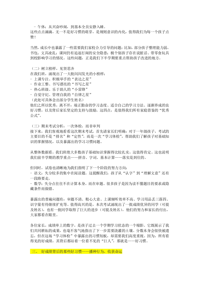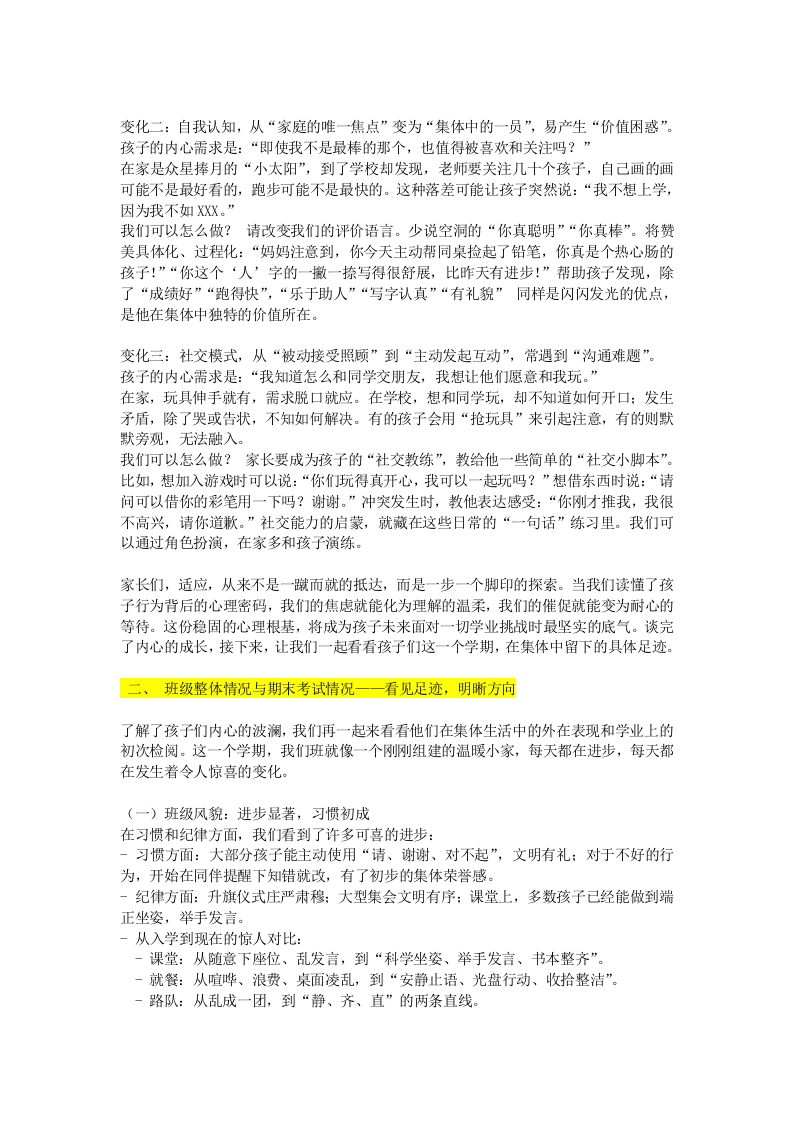 《一年级列车已过半》期末家长会发言稿尊敬的各位家长:大家下午好!我是本班的班主任X老师。首先,我代表学校,也代表我们班所有任课老师,对大家的到来表示最热烈的欢迎和最衷心的感谢!感谢你们在百忙之中,如约而至。今天的相聚,不是为了给孩子们贴上分数的标签,而是为了我们共同的孩子一一那些刚刚踏上求学旅程的小小身影。开学那天,目送他们背着小书包走进校园的情景还历历在目。那一刻,他们迈出的不仅是入学第一步,更是人生从“家庭中心”走向“社会集体”的关键跨越。转眼间,这趟“一年级列车”已平稳行驶过半程。此刻坐在教室里的您,心中或许都揣着相似的牵挂:我的孩子适应了吗?他在学校开心吗?他和同学相处得好吗?今天,我们就放下对分数的焦虑,像朋友一样,坐下来聊聊这一个学期以来,孩子们那些比分数更重要的成长,聚焦“一年级转折点”的几个核心真相。在我心中,对孩子们的期待一直非常清晰:我希望他们未来是“眼晴有光、心里有爱、学习有法、行为有度、成长有根”的人。我不希望他们只是会考试的“机器”,更希望他们能成长为:坚持努力、善良有礼、能独立学习、终身阅读的完整的人。我想,这也是我们所有家长的共同心愿。接下来,我将从七个方面,与大家分享我的观察、思考与建议。一、读懂一年级孩子的适应密码一一比成绩更重要的是心理扎根过去的一个学期,与其说我们在教知识,不如说我们在共同陪伴孩子经历一场巨大的“心理迁徙”。我们见证了太多动人的成长瞬间:有早上入园还要哭鼻子,现在能主动当“领操员”的宝贝:有最初躲在妈妈身后,现在敢于举手分享故事的孩子。这些外在行为的改变,其内核是一场静悄悄却又轰轰烈烈的“心理断乳”。孩子们每一个看似“反常”的小情绪、小抗拒,其实都是在向我们发送重要的“心理信号”,传递着他们未被满足的需求。读懂这些密码,比关注一次考试的分数重要得多。变化一:安全感来源,从“父母的怀抱”转向“陌生的环境”,容易陷入“不确定焦虑”。孩子的内心需求是:“我的新环境是安全的吗?我能掌控它吗?”刚从家庭“一对一”甚至“多对一”的呵护中走出来,孩子突然要面对许多不确定性:“上课不能随便说话”“想妈妈了怎么办”“水杯放在哪里”。这种失控感会引发焦虑。有的孩子表现为早上抗拒进校门,有的则可能频繁“肚子疼”想回家。这不是撒谎,而是焦虑情绪的躯体化表现。我们可以怎么做?每天睡前花5分钟,玩个“校园小复盘”的游戏。不问“学了什么”,而是问:“今天在学校最开心的一件事是什么?“你的同桌今天穿了什么颜色的衣服?”“饮水机旁边的柜子是用来放什么的?”通过回忆具体的、正向的细节,帮助孩子在脑海中构建一幅清晰、友好的“校园地图”,积累“我能熟悉这里、我能搞定”的确定感和信心。