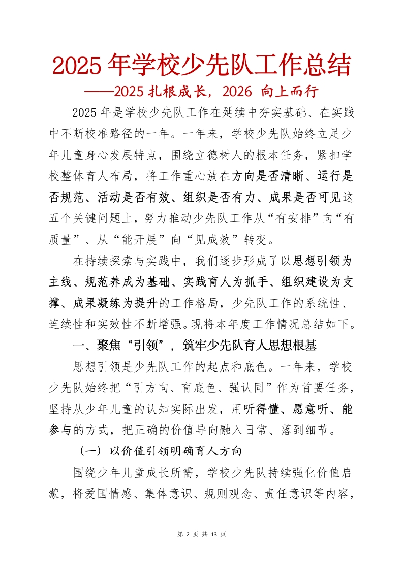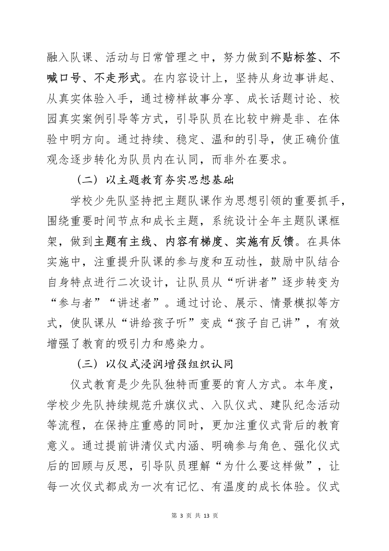 2025年学校少先队工作总结——2025扎根成长,2026向上而行晨晨老师15天前发布关注私信0.33MB13页04515 以下为资料部分截图预览,下载后为超高清原文件。 第1页 / 共13页 第2页 / 共13页 第3页 / 共13页 试读已结束,还剩10页,您可下载完整版后进行离线阅读 加入VIP,享海量教务资料,无限制免费下载所有材料 2025年学校少先队工作总结——2025扎根成长,2026向上而行此内容为付费资源,请付费后查看¥9.9¥15.9VIP会员免费代理(享70%分佣)免费立即购买您当前未登录!建议登陆后购买,可保存购买订单付费资源© 版权声明文章版权归作者所有,未经允许请勿转载。THE END综合资料 文本预览 2025年学校少先队工作总结2025扎根成长,2026向上而行目录一、聚焦“引领”,筑牢少先队育人思想根基…2(一)以价值引领明确育人方向.2(二)以主题教育夯实思想基础….3(三)以仪式浸润增强组织认同.3二、聚焦“规范”,提升少先队日常管理水平….4(一))在制度完善上持续用力,夯实规范运行基础…4(二)在过程管理上持续发力,提升自我管理效能….5(三)在行为养成上持续深化,推动规范内化于行.5三、聚焦“实践”,拓宽少先队育人实施路径5(一)在活动设计上突出主题导向,增强实践育人的整体指向性…6(二)在劳动体验上注重真实参与,提升队员责任意识与实践能力.6(三)在资源整合上增强协同联动,拓展实践育人的育人场景…7四、聚焦“建设”,增强少先队组织运行效能…7(一)在组织架构上不断优化,提升运行的系统性与协同性.8(二)在队伍培养上持续跟进,夯实少先队工作的人才基础.8(三)在阵地建设上稳步推进,拓展少先队育人承载空间9(四)在运行机制上持续完善,保障少先队工作有序推进.9五、聚焦“成效”,推动少先队工作提炼提升….10(一)系统梳理工作成果,形成清晰可见的成长图景….10(二)突出队员成长变化,体现育人工作的实际成效…11(三)强化示范引领作用,放大典型带动效应.11(四)注重经验沉淀转化,夯实持续改进基础.12第1页共13页 查看更多 收起部分 喜欢就支持一下吧点赞15 分享QQ空间微博QQ好友海报分享复制链接收藏