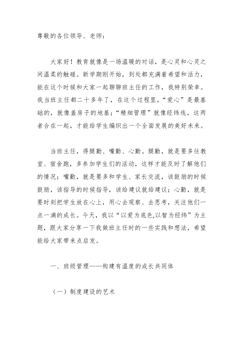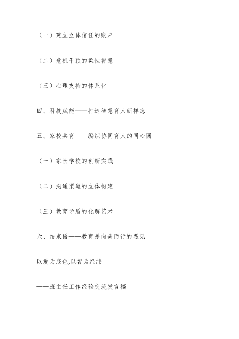 以爱为底色以智为经纬——班主任工作经验交流发言稿晨晨老师14天前发布关注私信18.47KB12页03310 以下为资料部分截图预览,下载后为超高清原文件。 第1页 / 共12页 第2页 / 共12页 第3页 / 共12页 试读已结束,还剩9页,您可下载完整版后进行离线阅读 加入VIP,享海量教务资料,无限制免费下载所有材料 以爱为底色以智为经纬——班主任工作经验交流发言稿此内容为付费资源,请付费后查看¥9.9¥15.9VIP会员免费代理(享70%分佣)免费立即购买您当前未登录!建议登陆后购买,可保存购买订单付费资源© 版权声明文章版权归作者所有,未经允许请勿转载。THE END综合资料 文本预览 以爱为底色,以智为经纬一一班主任工作经验交流发言稿一、班级管理一一构建有温度的成长共同体(一)制度建设的艺术(二)班干部培养智慧(三)班级文化的浸润二、育人实践一一在细微处播种品格之花(一)德育生活化渗透(二)个性化成长档案(三)主题活动的设计三、情感教育一一搭建心灵对话的彩虹桥 查看更多 收起部分 喜欢就支持一下吧点赞10 分享QQ空间微博QQ好友海报分享复制链接收藏