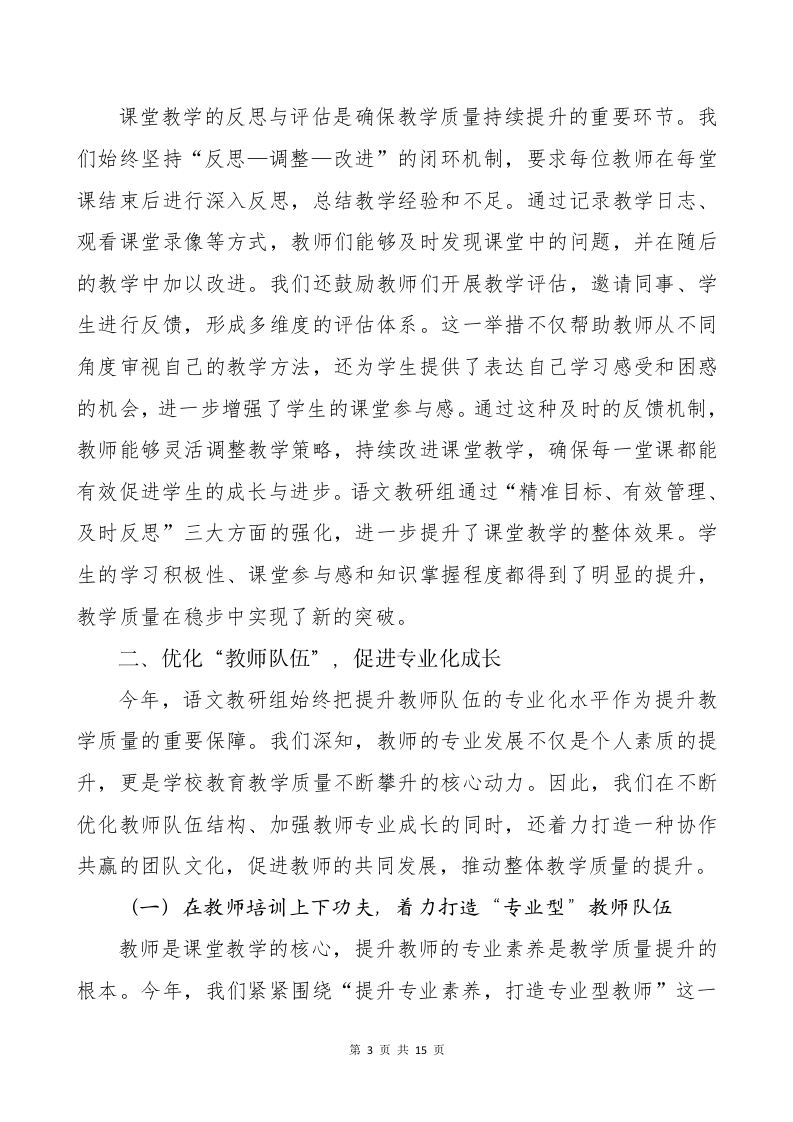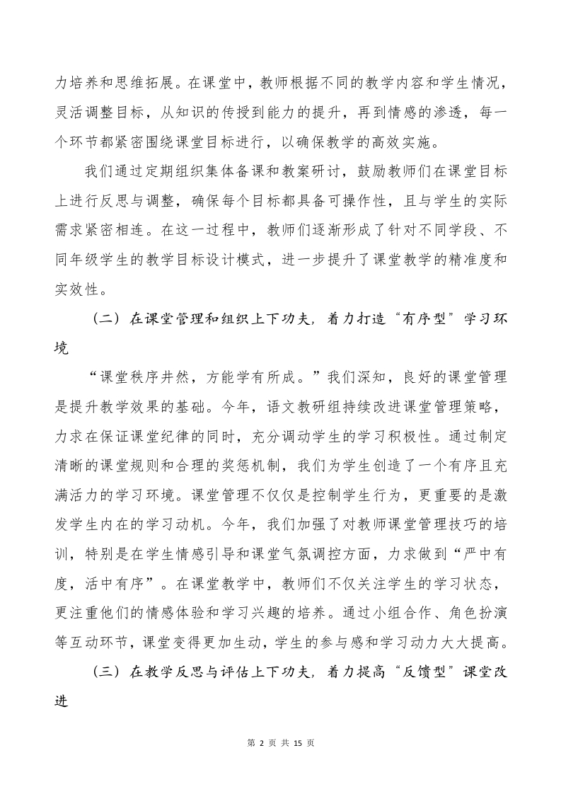 语文教研组工作总结晨晨老师14天前发布关注私信0.38MB15页04811 以下为资料部分截图预览,下载后为超高清原文件。 第1页 / 共15页 第2页 / 共15页 第3页 / 共15页 试读已结束,还剩12页,您可下载完整版后进行离线阅读 加入VIP,享海量教务资料,无限制免费下载所有材料 语文教研组工作总结此内容为付费资源,请付费后查看¥9.9¥15.9VIP会员免费代理(享70%分佣)免费立即购买您当前未登录!建议登陆后购买,可保存购买订单付费资源© 版权声明文章版权归作者所有,未经允许请勿转载。THE END综合资料 文本预览 2025-2026学年第一学期语文教研组工作总结“语”墨生辉谱新章,“文”以栽道共成长语文教研组以提升教学质量为标尺,紧跟教育步伐,深耕课堂教学的每一细节,精雕细琢,“一课一练”细致入微,“一研一评”层层推进,力求在“小中见大、急中见静、难中求胜”的工作理念指导下,稳步前行、精准发力。我们不断优化教学方法、创新教研模式、提升教学实效,步步为赢,在课堂教学和教研工作中谱写了新的篇章。现将本年度工作总结汇报如下:一、提升“教学实效”,增强课堂教学的整体效果今年来,本语文教研组秉承“以学生为本”的教育理念,在课堂教学改革中稳步前行,通过精细化的教学目标设定、有效的课堂管理、以及持续的教学反思与评估,进一步推动了教学质量的提升。我们不断强化“教学实效”,力求在每一次课堂中实现“有效性”和“高效性”的双重目标,为学生的成长和发展提供更加坚实的基础。(一)在课堂目标精准性上下功夫,着力提升“高效型”课堂教学精准设定教学目标,犹如航船的舵手,能够引领教学工作走向更高效的目标。今年,我们始终坚守“从目标出发”的原则,要求每一堂课的教学目标都要明确、具体,且符合学生的认知需求和发展水平。通过这一措施,我们的教学不再是简单的知识传递,而是有深度的能第1页共15页 查看更多 收起部分 喜欢就支持一下吧点赞11 分享QQ空间微博QQ好友海报分享复制链接收藏