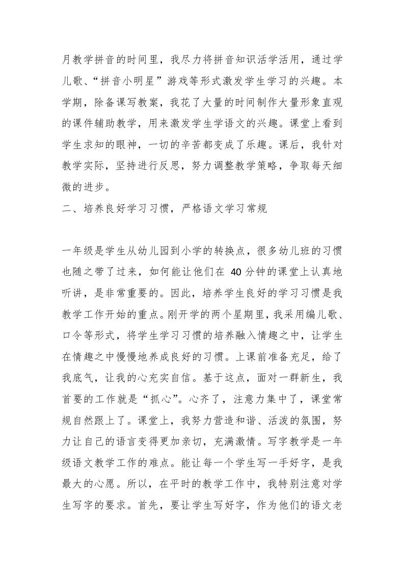 2025年小学统编版一年级语文上册教学工作总结晨晨老师13天前发布关注私信13.73KB4页0455 以下为资料部分截图预览,下载后为超高清原文件。 第1页 / 共4页 第2页 / 共4页 试读已结束,还剩2页,您可下载完整版后进行离线阅读 加入VIP,享海量教务资料,无限制免费下载所有材料 2025年小学统编版一年级语文上册教学工作总结此内容为付费资源,请付费后查看¥9.9¥15.9VIP会员免费代理(享70%分佣)免费立即购买您当前未登录!建议登陆后购买,可保存购买订单付费资源© 版权声明文章版权归作者所有,未经允许请勿转载。THE END综合资料 文本预览 2025年小学统编版一年级语文上册教学工作总结时间过的真快,转眼间就到了学期末,本学期我担任一年级的语文教学工作。作为一名教师,我对于自己所从事的事业不敢有半点懈怠。本着一切为了学生的发展为前提,尽自己最大的努力较好地完成了本学期的教学任务。下面将我的教学工作做如下总结:一、细读教学内容,精心组织教学一年级一册的语文教学任务繁重,汉语拼音知识既是学生学好语文的基础,又是学好语文的重点。要求学生认对、读准23个声母、24个韵母和16个整体认读音节,能准确地拼读音节,能说出声调符号的名称,读准四声,学读轻声,认识四线格,能正确书写声母、韵母和音节;能借助汉语拼音识字、正音、学说普通话;认识常用汉字300个,其中100个要求会写。这么大的学习量如果不讲究科学合理的方法,而让学生单调地读,重复地写,长此以往,学生将对拼读、识字产生厌恶情绪。由于一年级小朋友以不随意记忆为主,课堂上经常会发生这样那样想不到的状况。在开学前一个半 查看更多 收起部分 喜欢就支持一下吧点赞5 分享QQ空间微博QQ好友海报分享复制链接收藏